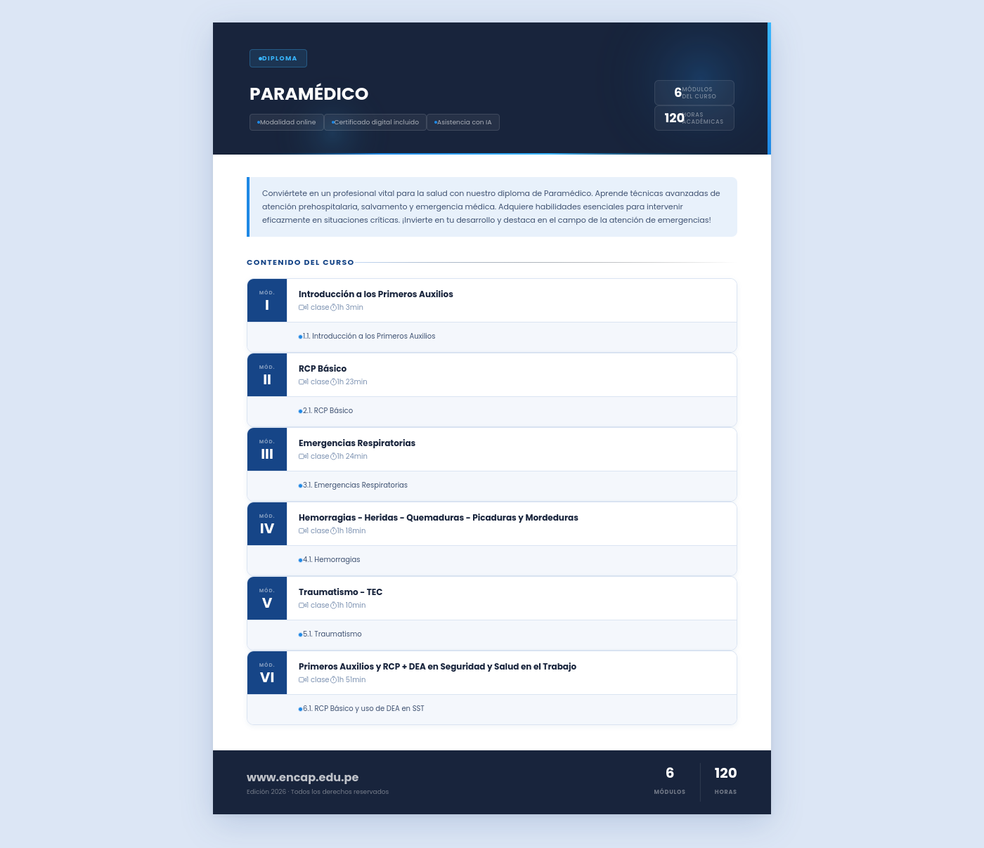 Conviértete en un profesional vital para la salud con nuestro diploma de Paramédico. Aprende técnicas avanzadas de atención prehospitalaria, salvamento y emergencia médica. Adquiere habilidades esenciales para intervenir eficazmente en situaciones críticas. ¡Invierte en tu desarrollo y destaca en el campo de la atención de emergencias!