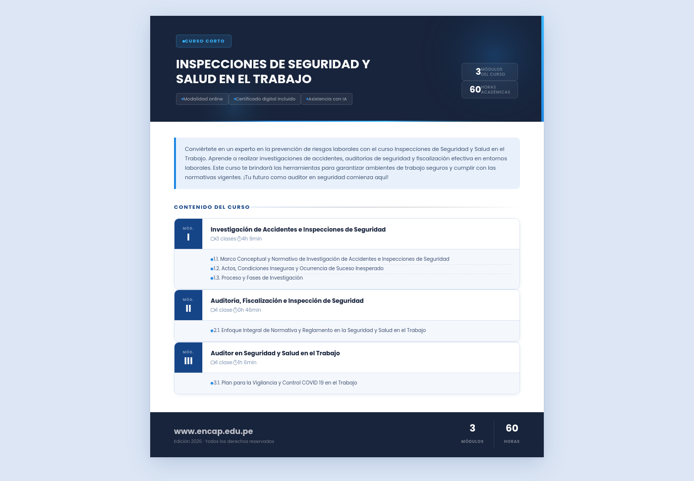Conviértete en un experto en la prevención de riesgos laborales con el curso Inspecciones de Seguridad y Salud en el Trabajo. Aprende a realizar investigaciones de accidentes, auditorías de seguridad y fiscalización efectiva en entornos laborales. Este curso te brindará las herramientas para garantizar ambientes de trabajo seguros y cumplir con las normativas vigentes. ¡Tu futuro como auditor en seguridad comienza aquí!