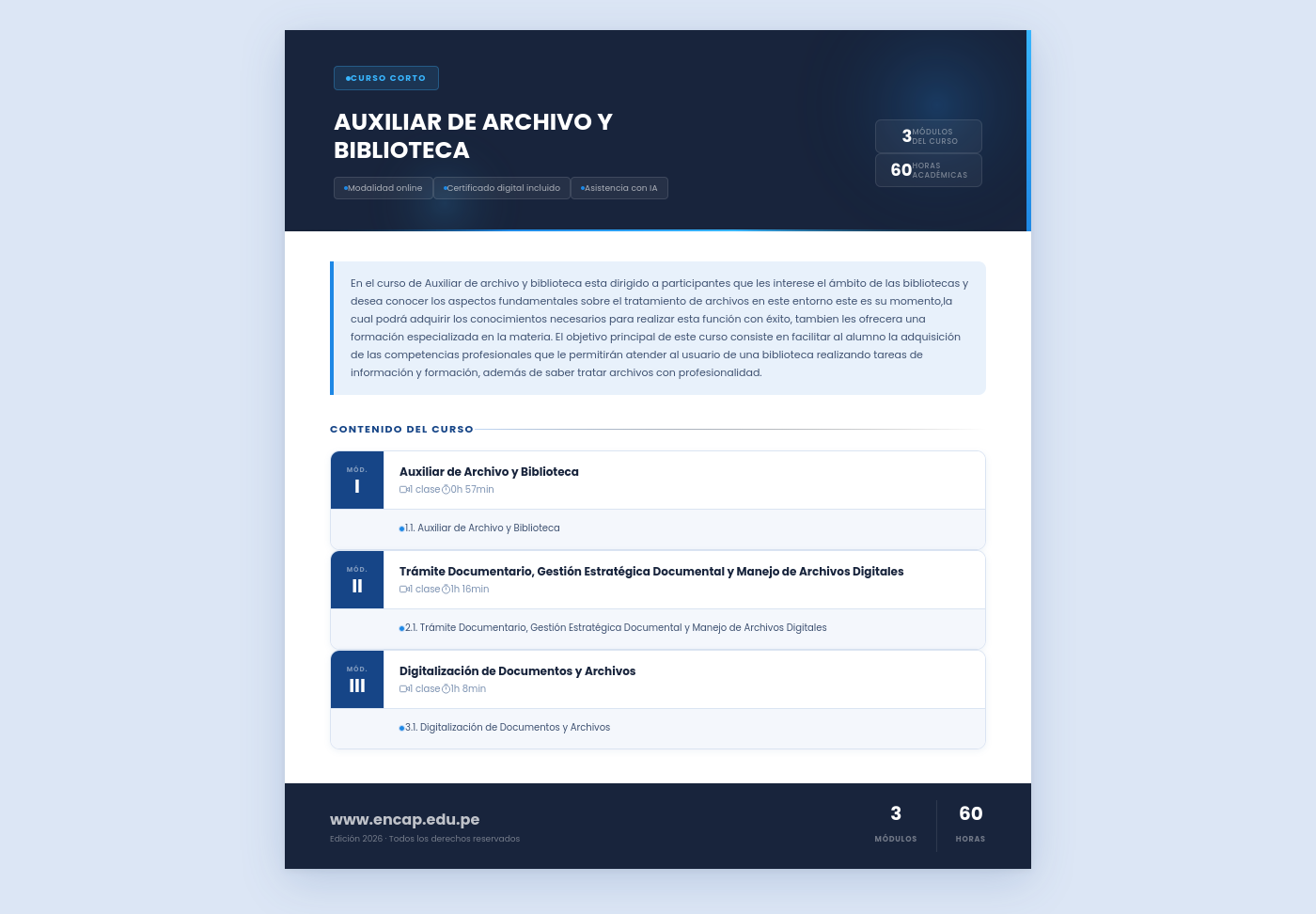 En el curso de Auxiliar de archivo y biblioteca esta dirigido a participantes que les interese el ámbito de las bibliotecas y desea conocer los aspectos fundamentales sobre el tratamiento de archivos en este entorno este es su momento,la cual podrá adquirir los conocimientos necesarios para realizar esta función con éxito, tambien les ofrecera una formación especializada en la materia. El objetivo principal de este curso consiste en facilitar al alumno la adquisición de las competencias profesionales que le permitirán atender al usuario de una biblioteca realizando tareas de información y formación, además de saber tratar archivos con profesionalidad.