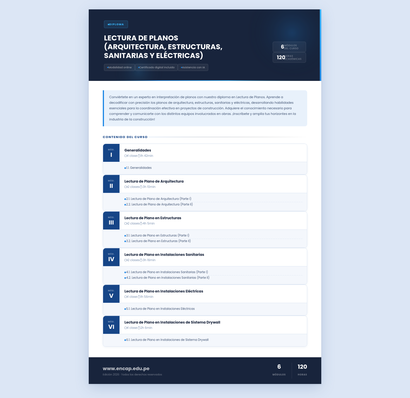 Conviértete en un experto en interpretación de planos con nuestro diploma en Lectura de Planos. Aprende a decodificar con precisión los planos de arquitectura, estructuras, sanitarias y eléctricas, desarrollando habilidades esenciales para la coordinación efectiva en proyectos de construcción. Adquiere el conocimiento necesario para comprender y comunicarte con los distintos equipos involucrados en obras. ¡Inscríbete y amplía tus horizontes en la industria de la construcción!