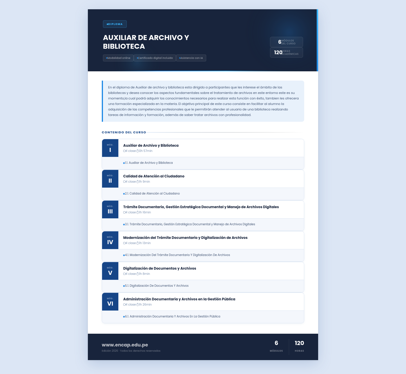 En el diploma de Auxiliar de archivo y biblioteca esta dirigido a participantes que les interese el ámbito de las bibliotecas y desea conocer los aspectos fundamentales sobre el tratamiento de archivos en este entorno este es su momento,la cual podrá adquirir los conocimientos necesarios para realizar esta función con éxito, tambien les ofrecera una formación especializada en la materia. El objetivo principal de este curso consiste en facilitar al alumno la adquisición de las competencias profesionales que le permitirán atender al usuario de una biblioteca realizando tareas de información y formación, además de saber tratar archivos con profesionalidad.