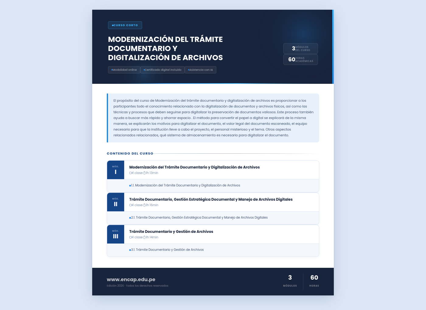 El propósito del curso de Modernización del trámite documentario y digitalización de archivos es proporcionar a los participantes todo el conocimiento relacionado con la digitalización de documentos y archivos físicos, así como las técnicas y procesos que deben seguirse para digitalizar la preservación de documentos valiosos. Este proceso también ayuda a buscar más rápido y ahorrar espacio . El método para convertir el papel a digital se explicará de la misma manera, se explicarán los motivos para digitalizar el documento, el valor legal del documento escaneado, el equipo necesario para que la institución lleve a cabo el proyecto, el personal misterioso y el tema. Otros aspectos relacionados relacionados, qué sistema de almacenamiento es necesario para digitalizar el documento.