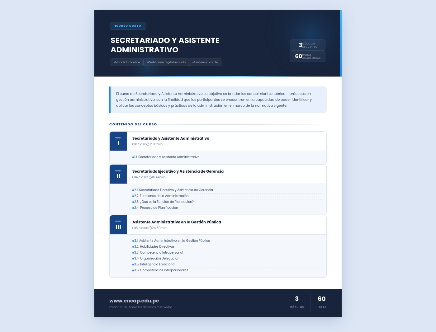 El curso de Secretariado y Asistente Administrativo su objetivo es brindar los conocimientos teórico – prácticos en gestión administrativa, con la finalidad que los participantes se encuentren en la capacidad de poder identificar y aplicar los conceptos básicos y prácticos de la administración en el marco de la normativa vigente.