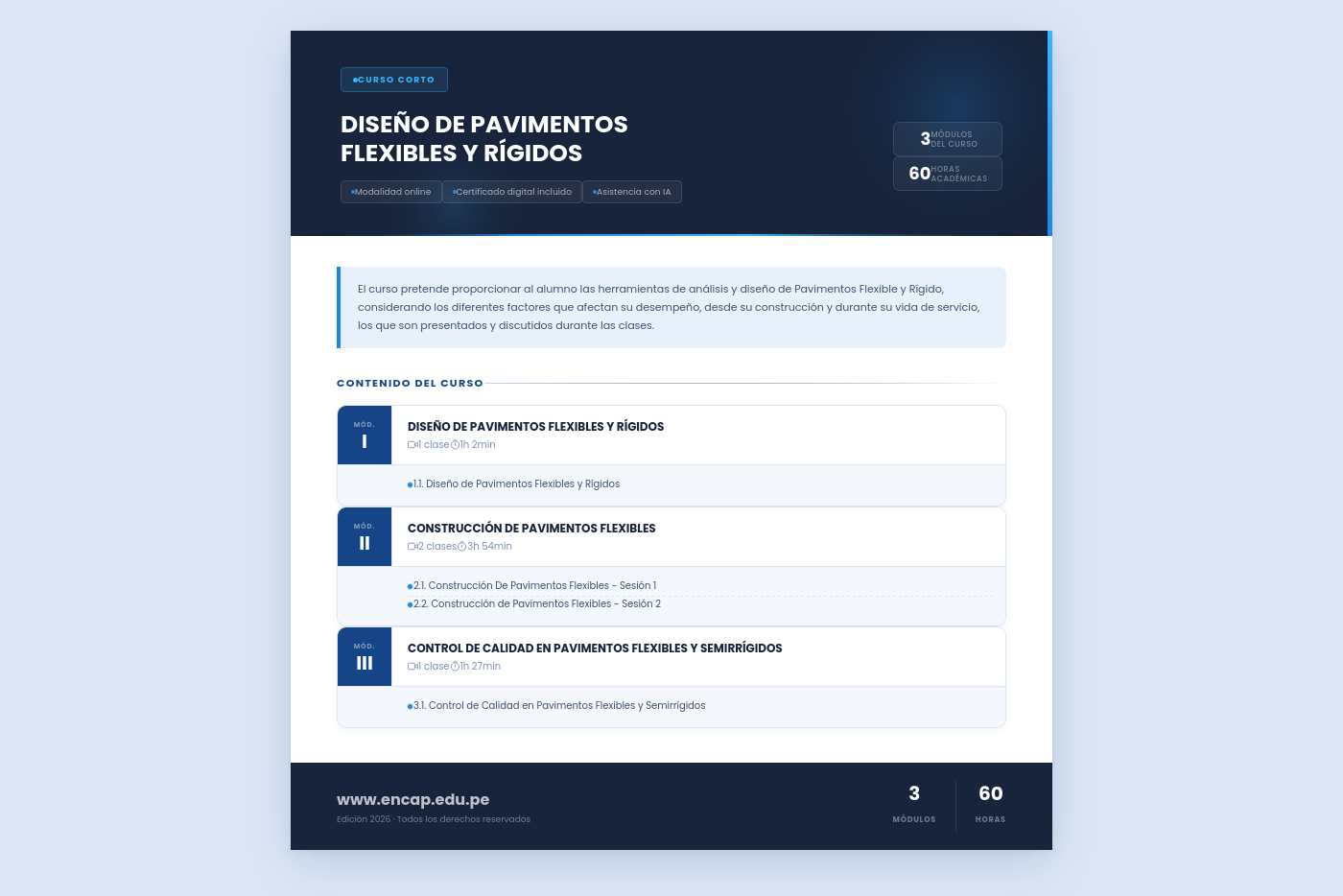El curso pretende proporcionar al alumno las herramientas de análisis y diseño de Pavimentos Flexible y Rígido, considerando los diferentes factores que afectan su desempeño, desde su construcción y durante su vida de servicio, los que son presentados y discutidos durante las clases.