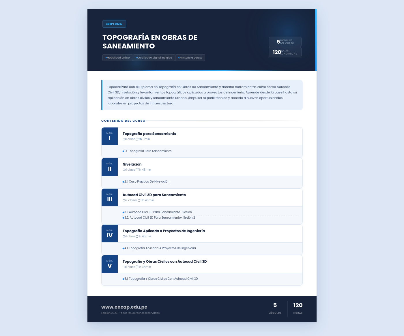 Especialízate con el Diploma en Topografía en Obras de Saneamiento y domina herramientas clave como Autocad Civil 3D, nivelación y levantamientos topográficos aplicados a proyectos de ingeniería. Aprende desde la base hasta su aplicación en obras civiles y saneamiento urbano. ¡Impulsa tu perfil técnico y accede a nuevas oportunidades laborales en proyectos de infraestructura!