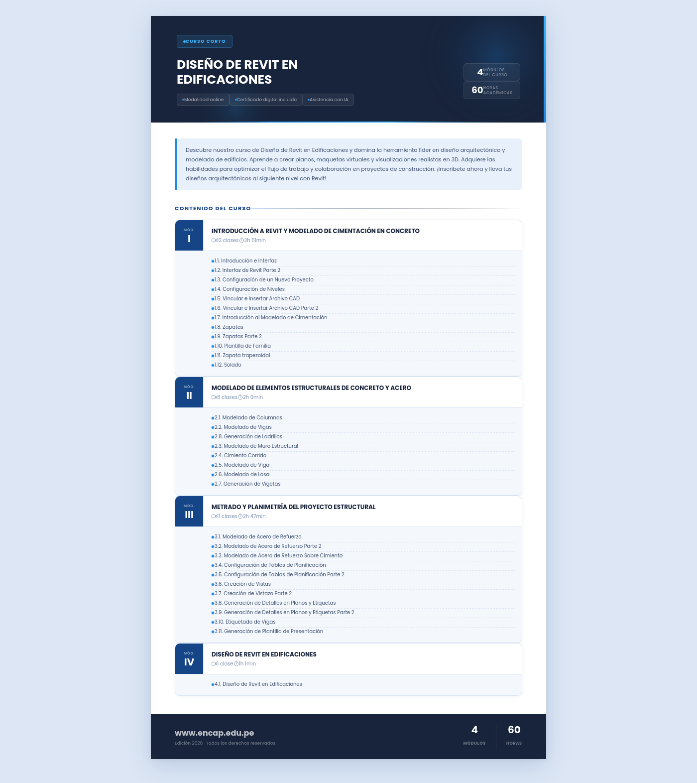 Descubre nuestro curso de Diseño de Revit en Edificaciones y domina la herramienta líder en diseño arquitectónico y modelado de edificios. Aprende a crear planos, maquetas virtuales y visualizaciones realistas en 3D. Adquiere las habilidades para optimizar el flujo de trabajo y colaboración en proyectos de construcción. ¡Inscríbete ahora y lleva tus diseños arquitectónicos al siguiente nivel con Revit!