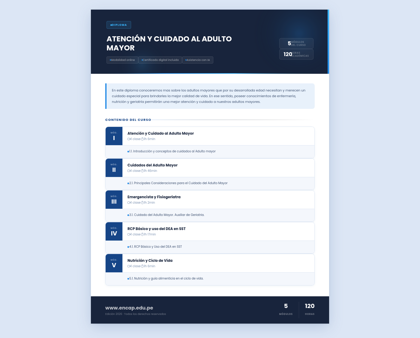 En este diploma conoceremos mas sobre los adultos mayores que por su desarrollada edad necesitan y merecen un cuidado especial para brindarles la mejor calidad de vida. En ese sentido, poseer conocimientos de enfermería, nutrición y geriatría permitirán una mejor atención y cuidado a nuestros adultos mayores.