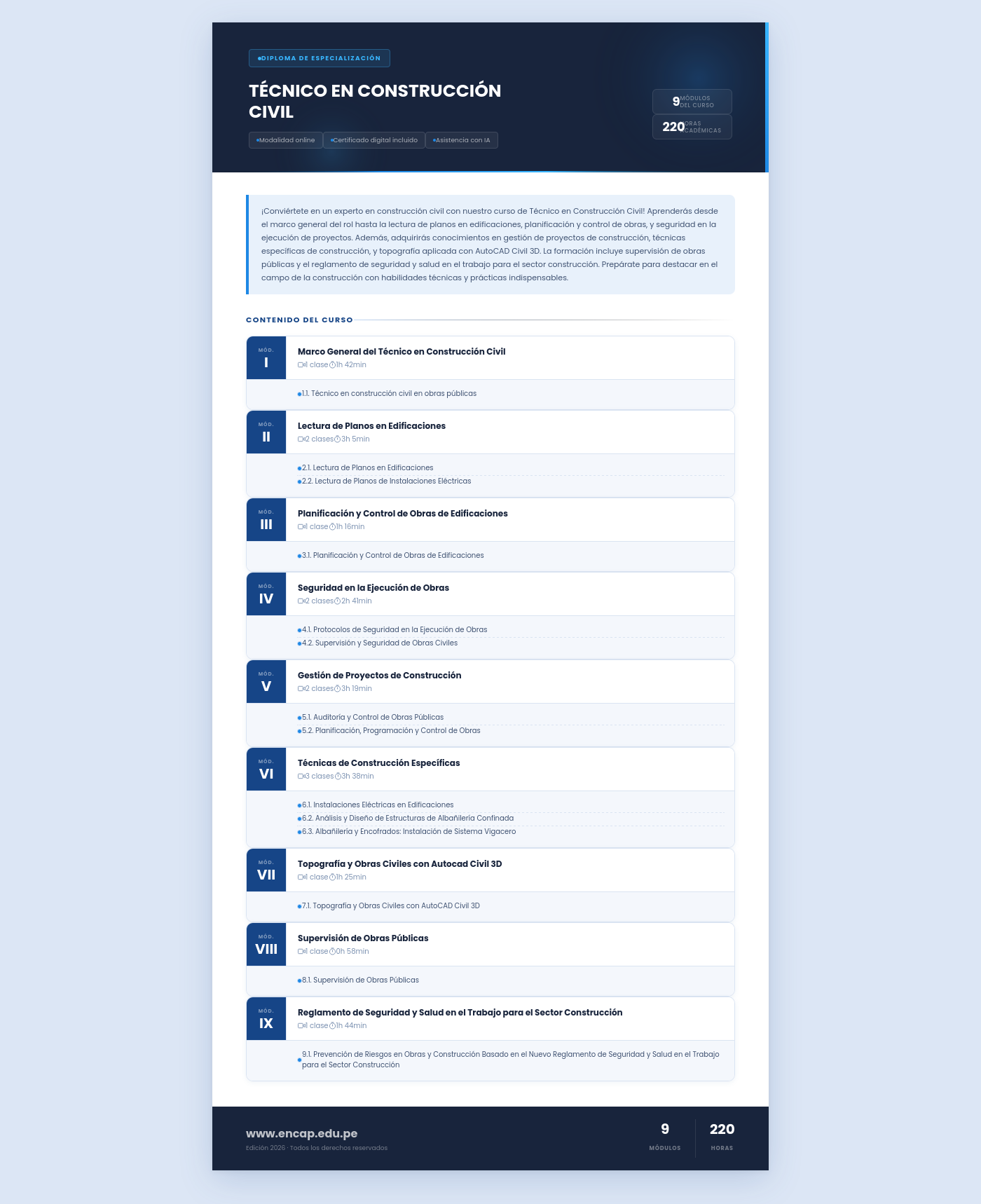 ¡Conviértete en un experto en construcción civil con nuestro curso de Técnico en Construcción Civil! Aprenderás desde el marco general del rol hasta la lectura de planos en edificaciones, planificación y control de obras, y seguridad en la ejecución de proyectos. Además, adquirirás conocimientos en gestión de proyectos de construcción, técnicas específicas de construcción, y topografía aplicada con AutoCAD Civil 3D. La formación incluye supervisión de obras públicas y el reglamento de seguridad y salud en el trabajo para el sector construcción. Prepárate para destacar en el campo de la construcción con habilidades técnicas y prácticas indispensables.