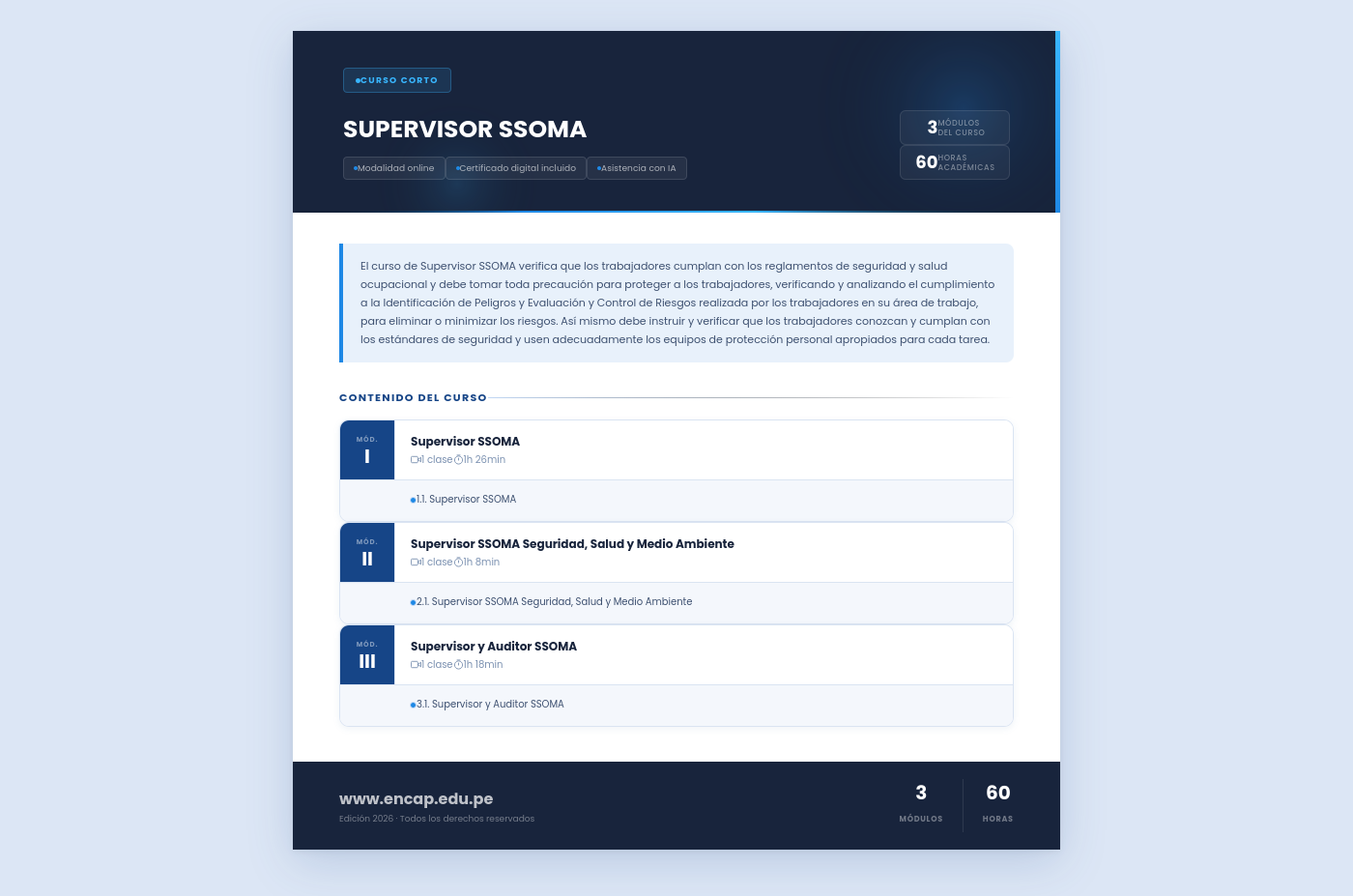 El curso de Supervisor SSOMA verifica que los trabajadores cumplan con los reglamentos de seguridad y salud ocupacional y debe tomar toda precaución para proteger a los trabajadores, verificando y analizando el cumplimiento a la Identificación de Peligros y Evaluación y Control de Riesgos realizada por los trabajadores en su área de trabajo, para eliminar o minimizar los riesgos. Así mismo debe instruir y verificar que los trabajadores conozcan y cumplan con los estándares de seguridad y usen adecuadamente los equipos de protección personal apropiados para cada tarea.