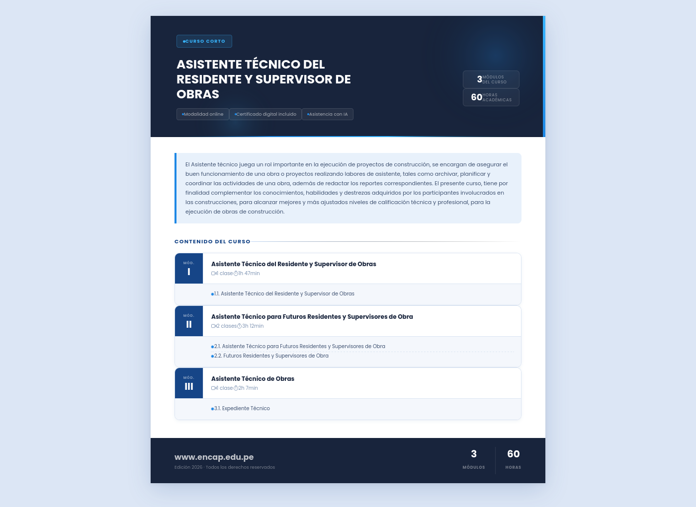 El Asistente técnico juega un rol importante en la ejecución de proyectos de construcción, se encargan de asegurar el buen funcionamiento de una obra o proyectos realizando labores de asistente, tales como archivar, planificar y coordinar las actividades de una obra, además de redactar los reportes correspondientes. El presente curso, tiene por finalidad complementar los conocimientos, habilidades y destrezas adquiridos por los participantes involucrados en las construcciones, para alcanzar mejores y más ajustados niveles de calificación técnica y profesional, para la ejecución de obras de construcción.