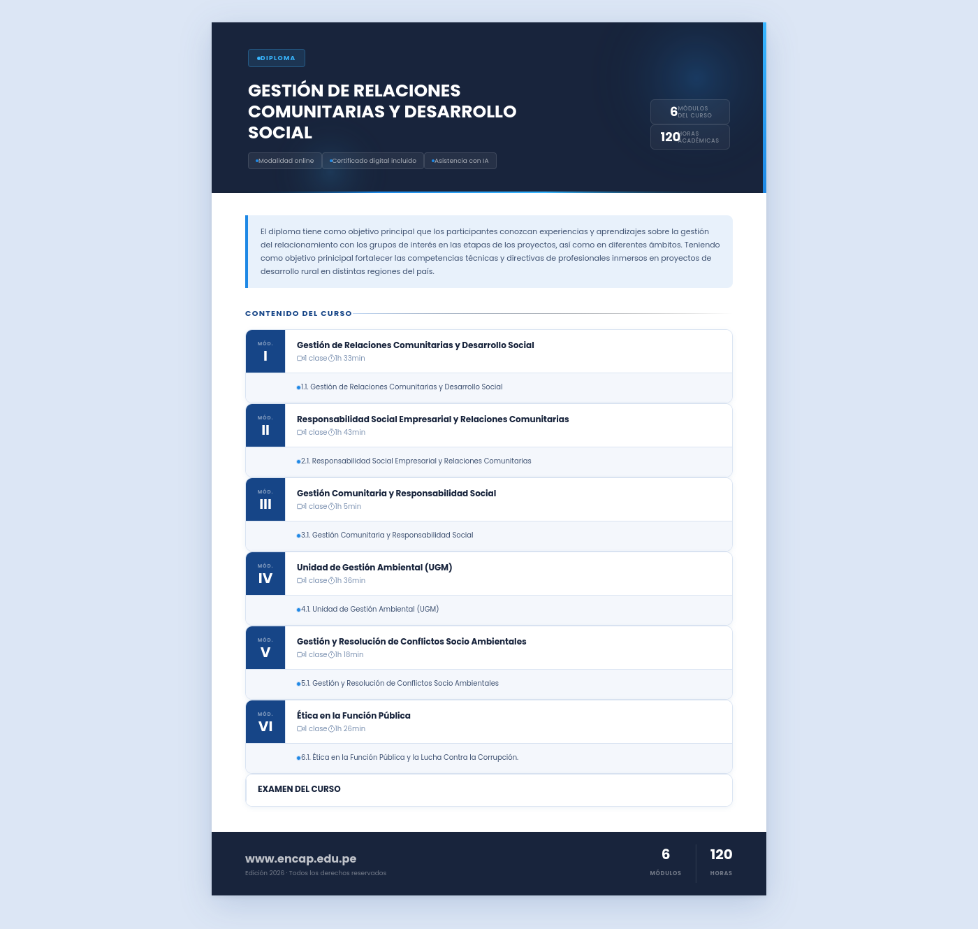 El diploma tiene como objetivo principal que los participantes conozcan experiencias y aprendizajes sobre la gestión del relacionamiento con los grupos de interés en las etapas de los proyectos, así como en diferentes ámbitos. Teniendo como objetivo prinicipal fortalecer las competencias técnicas y directivas de profesionales inmersos en proyectos de desarrollo rural en distintas regiones del país.
