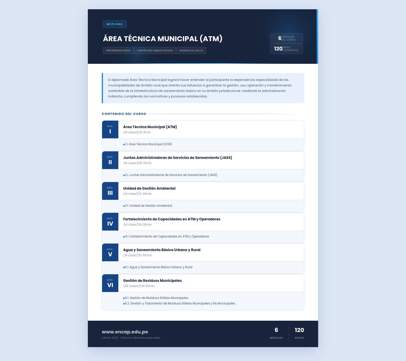 El diplomade Área Técnica Municipal logrará hacer entender al participante la dependencia especializada de las municipalidades de ámbito rural que orienta sus esfuerzos a garantizar la gestión, uso, operación y mantenimiento sostenible de la infraestructura de saneamiento básico en su ámbito jurisdiccional, mediante la administración indirecta, cumpliendo las normativas y procesos establecidos.