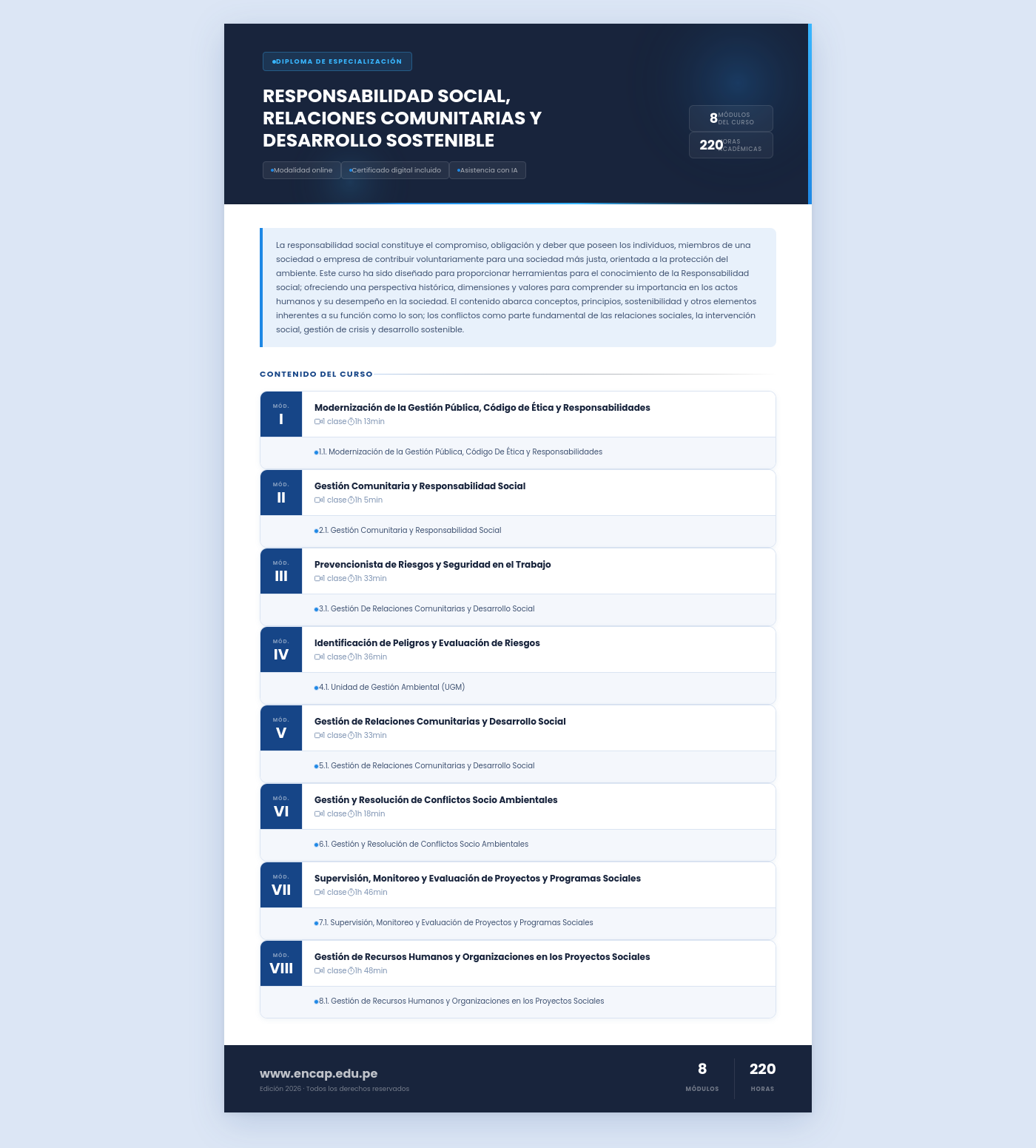 La responsabilidad social constituye el compromiso, obligación y deber que poseen los individuos, miembros de una sociedad o empresa de contribuir voluntariamente para una sociedad más justa, orientada a la protección del ambiente. Este curso ha sido diseñado para proporcionar herramientas para el conocimiento de la Responsabilidad social; ofreciendo una perspectiva histórica, dimensiones y valores para comprender su importancia en los actos humanos y su desempeño en la sociedad. El contenido abarca conceptos, principios, sostenibilidad y otros elementos inherentes a su función como lo son; los conflictos como parte fundamental de las relaciones sociales, la intervención social, gestión de crisis y desarrollo sostenible.