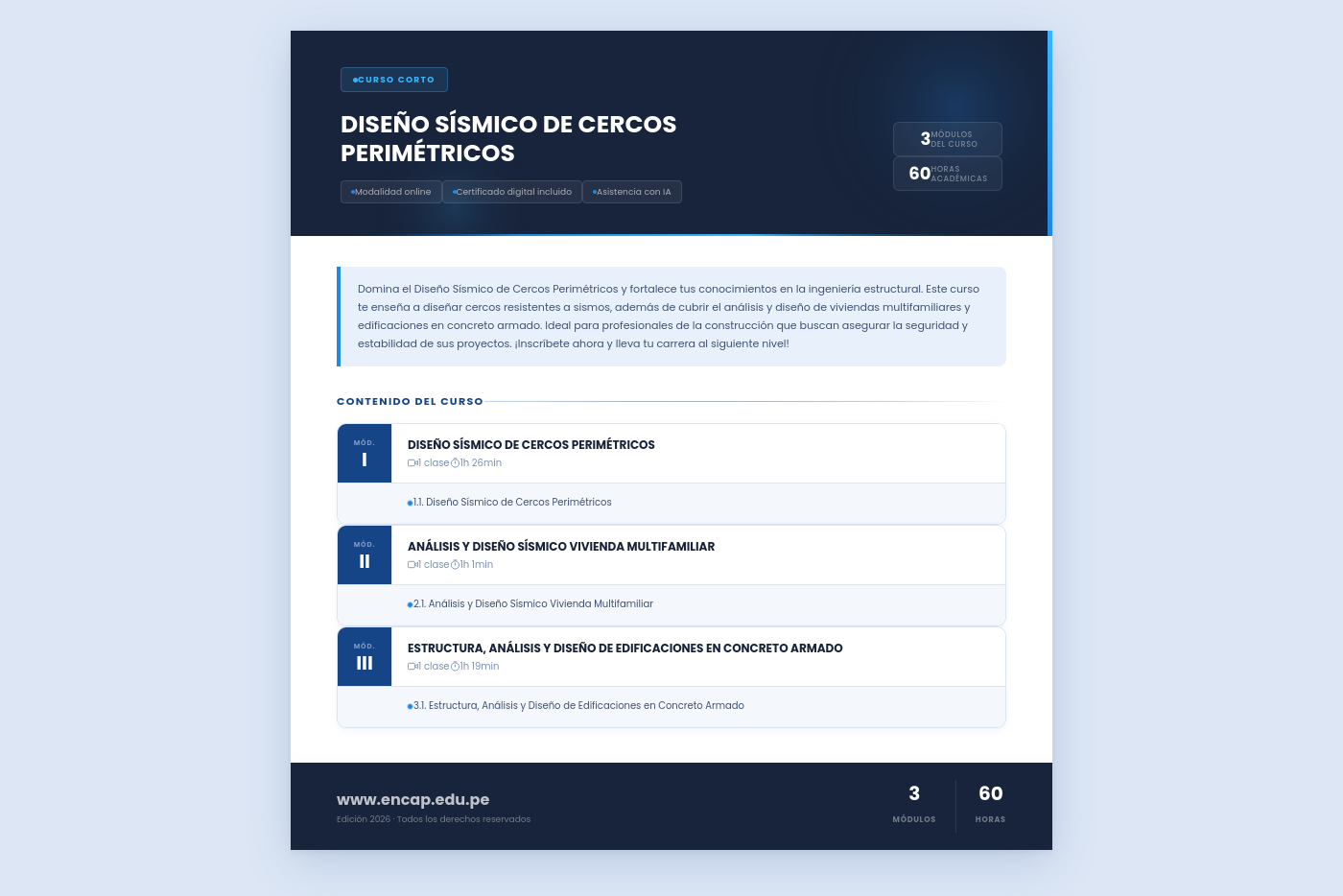 Domina el Diseño Sísmico de Cercos Perimétricos y fortalece tus conocimientos en la ingeniería estructural. Este curso te enseña a diseñar cercos resistentes a sismos, además de cubrir el análisis y diseño de viviendas multifamiliares y edificaciones en concreto armado. Ideal para profesionales de la construcción que buscan asegurar la seguridad y estabilidad de sus proyectos. ¡Inscríbete ahora y lleva tu carrera al siguiente nivel!