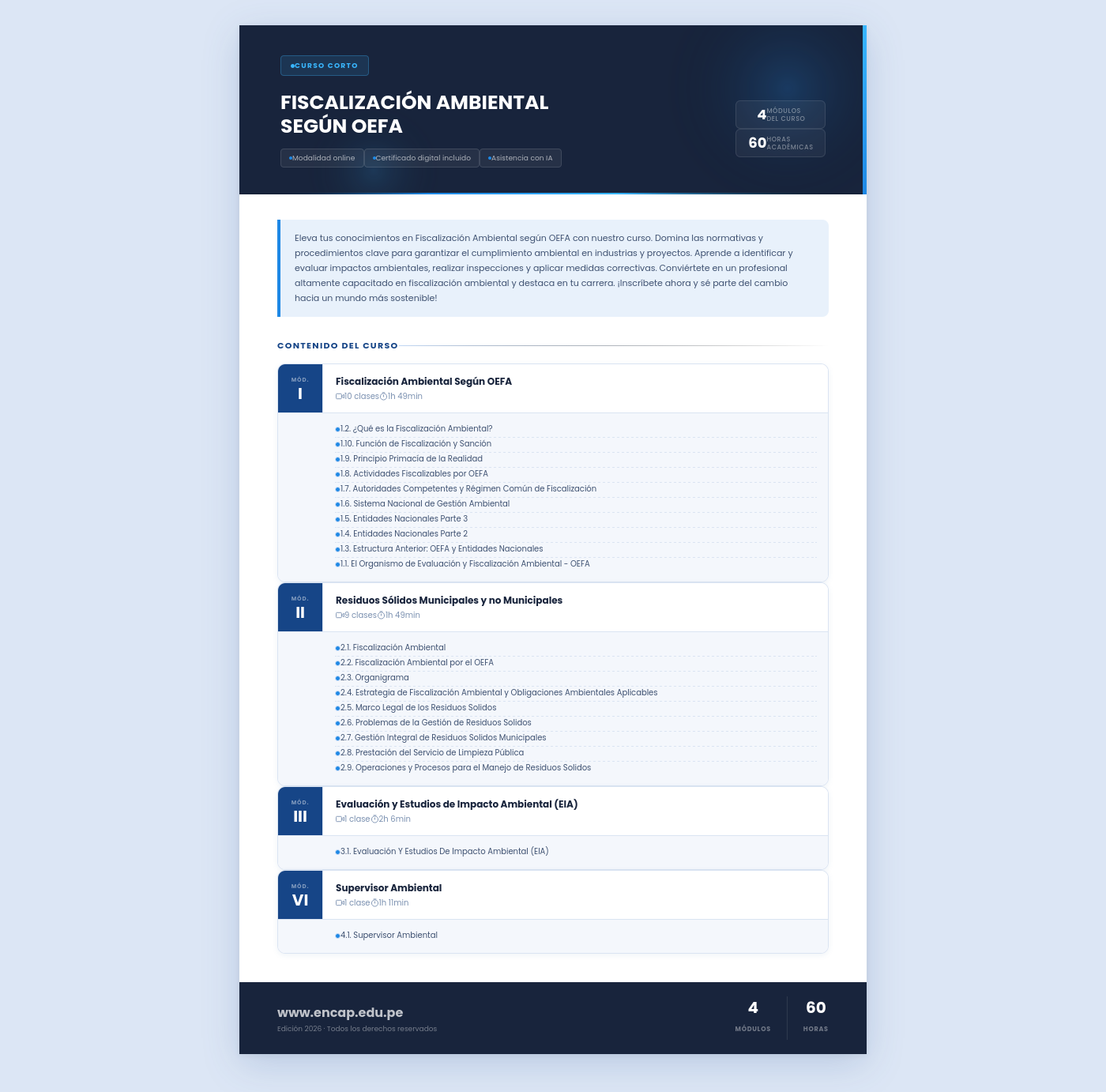 Eleva tus conocimientos en Fiscalización Ambiental según OEFA con nuestro curso. Domina las normativas y procedimientos clave para garantizar el cumplimiento ambiental en industrias y proyectos. Aprende a identificar y evaluar impactos ambientales, realizar inspecciones y aplicar medidas correctivas. Conviértete en un profesional altamente capacitado en fiscalización ambiental y destaca en tu carrera. ¡Inscríbete ahora y sé parte del cambio hacia un mundo más sostenible!