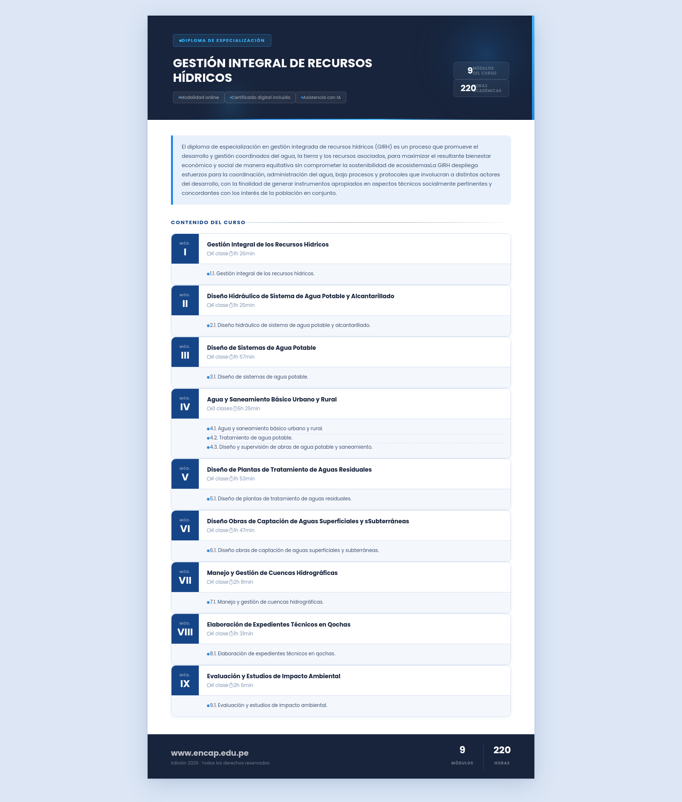 El diploma de especialización en gestión integrada de recursos hídricos (GIRH) es un proceso que promueve el desarrollo y gestión coordinados del agua, la tierra y los recursos asociados, para maximizar el resultante bienestar económico y social de manera equitativa sin comprometer la sostenibilidad de ecosistemasLa GIRH despliega esfuerzos para la coordinación, administración del agua, bajo procesos y protocoles que involucran a distintos actores del desarrollo, con la finalidad de generar instrumentos apropiados en aspectos técnicos socialmente pertinentes y concordantes con los interés de la población en conjunto.