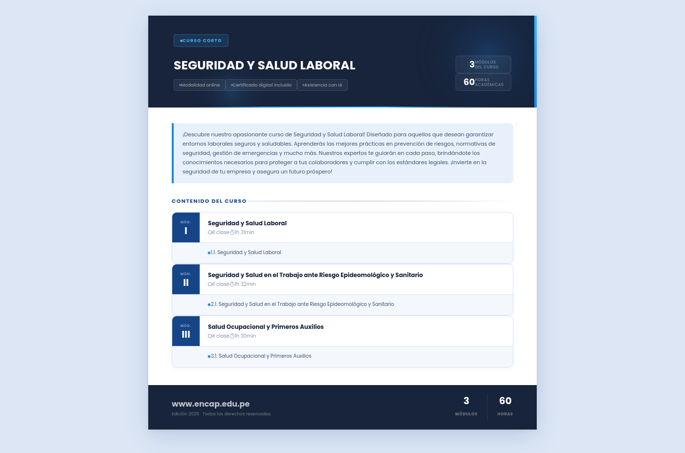 ¡Descubre nuestro apasionante curso de Seguridad y Salud Laboral! Diseñado para aquellos que desean garantizar entornos laborales seguros y saludables. Aprenderás las mejores prácticas en prevención de riesgos, normativas de seguridad, gestión de emergencias y mucho más. Nuestros expertos te guiarán en cada paso, brindándote los conocimientos necesarios para proteger a tus colaboradores y cumplir con los estándares legales. ¡Invierte en la seguridad de tu empresa y asegura un futuro próspero!
