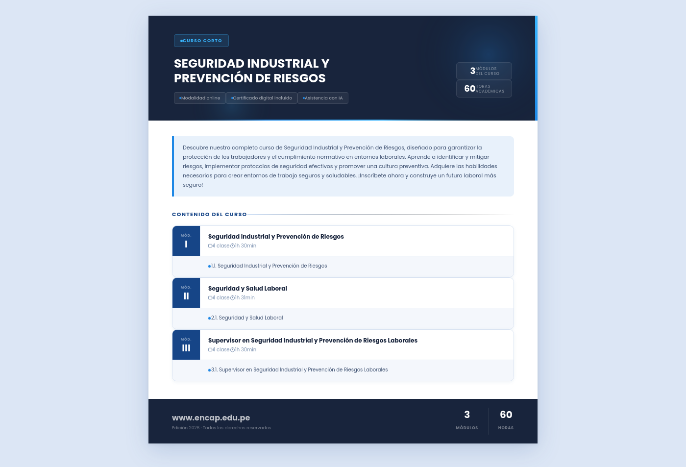 Descubre nuestro completo curso de Seguridad Industrial y Prevención de Riesgos, diseñado para garantizar la protección de los trabajadores y el cumplimiento normativo en entornos laborales. Aprende a identificar y mitigar riesgos, implementar protocolos de seguridad efectivos y promover una cultura preventiva. Adquiere las habilidades necesarias para crear entornos de trabajo seguros y saludables. ¡Inscríbete ahora y construye un futuro laboral más seguro!
