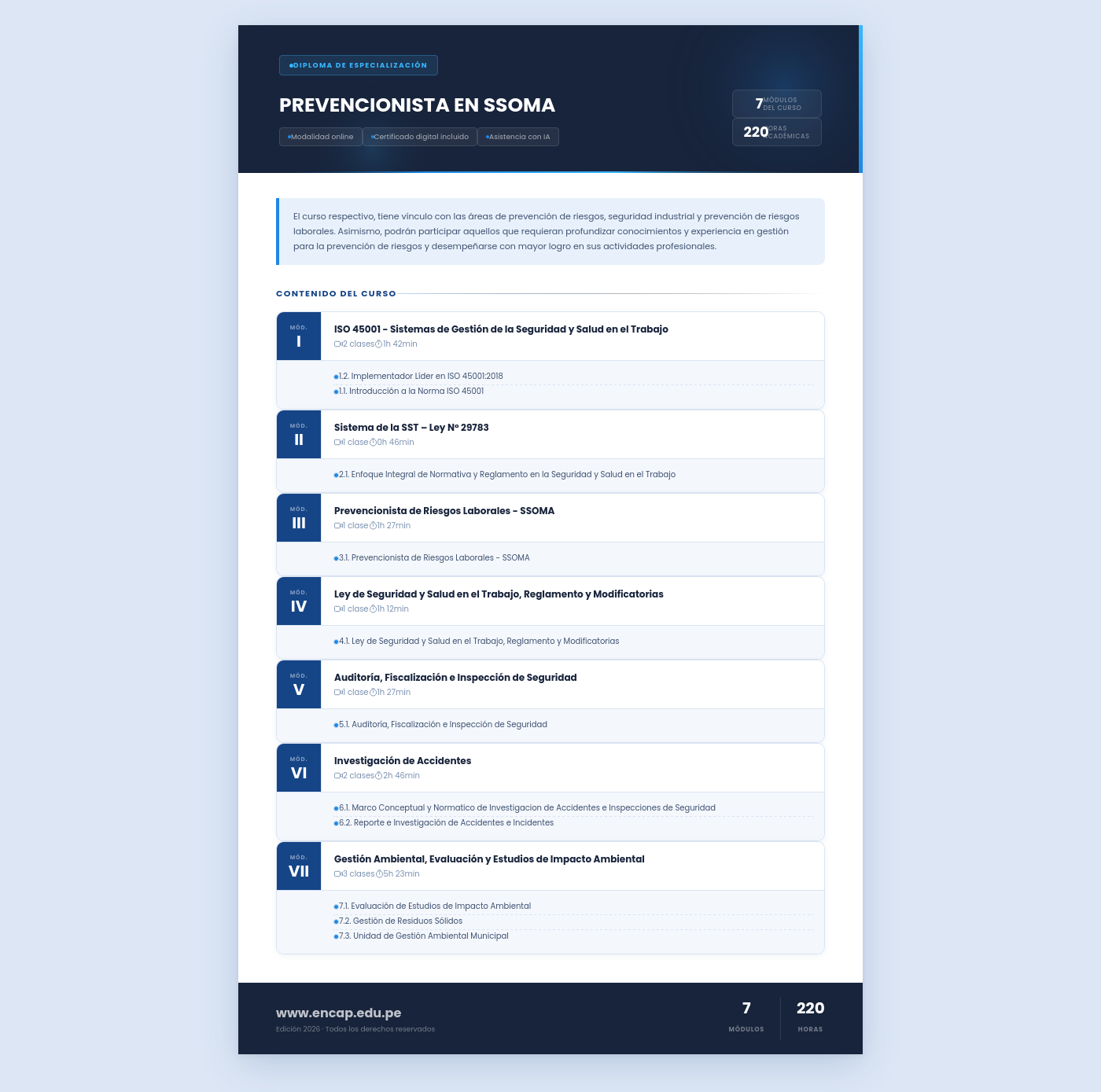 El curso respectivo, tiene vínculo con las áreas de prevención de riesgos, seguridad industrial y prevención de riesgos laborales. Asimismo, podrán participar aquellos que requieran profundizar conocimientos y experiencia en gestión para la prevención de riesgos y desempeñarse con mayor logro en sus actividades profesionales.