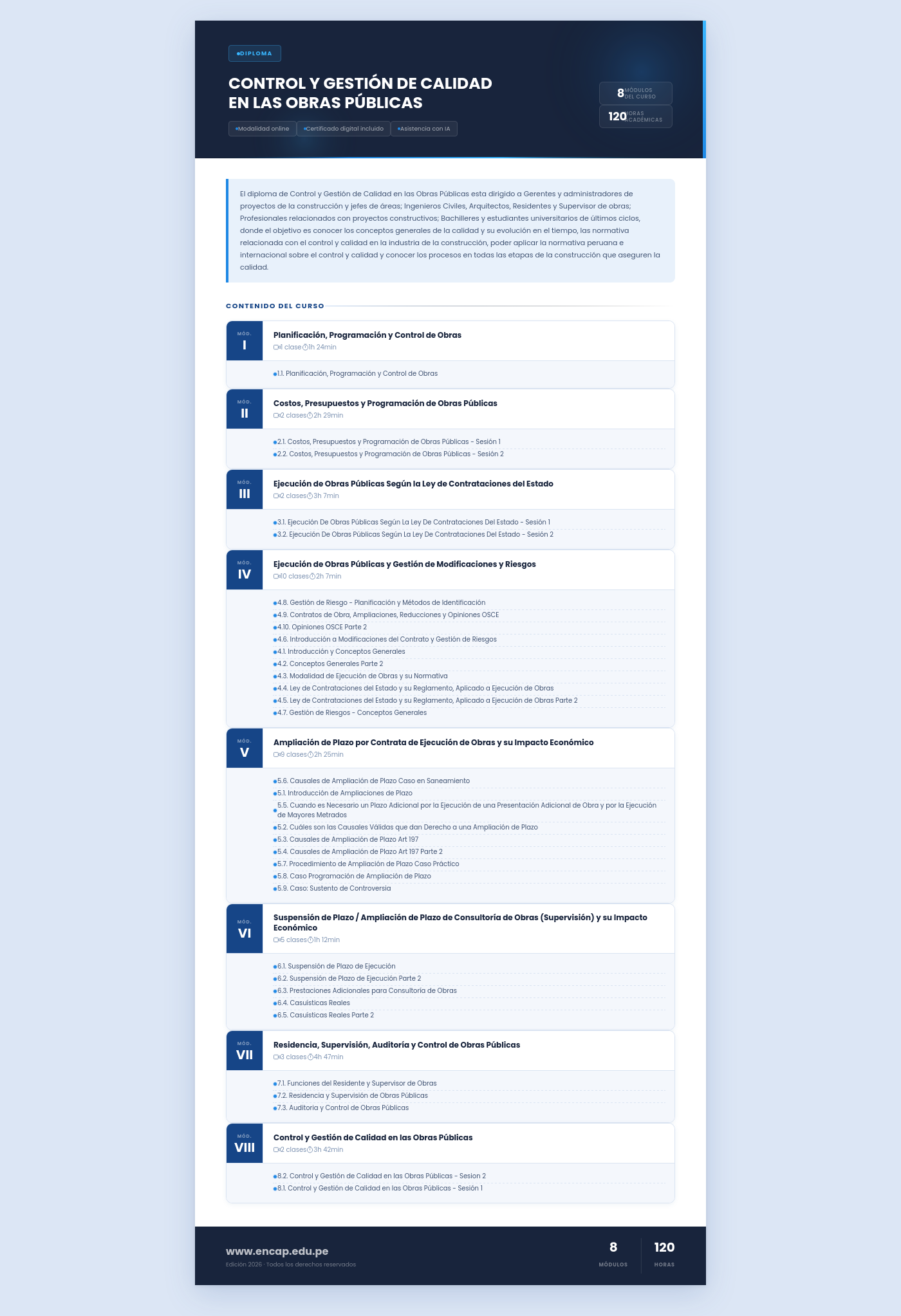 El diploma de Control y Gestión de Calidad en las Obras Públicas esta dirigido a Gerentes y administradores de proyectos de la construcción y jefes de áreas; Ingenieros Civiles, Arquitectos, Residentes y Supervisor de obras; Profesionales relacionados con proyectos constructivos; Bachilleres y estudiantes universitarios de últimos ciclos, donde el objetivo es conocer los conceptos generales de la calidad y su evolución en el tiempo, las normativa relacionada con el control y calidad en la industria de la construcción, poder aplicar la normativa peruana e internacional sobre el control y calidad y conocer los procesos en todas las etapas de la construcción que aseguren la calidad.
