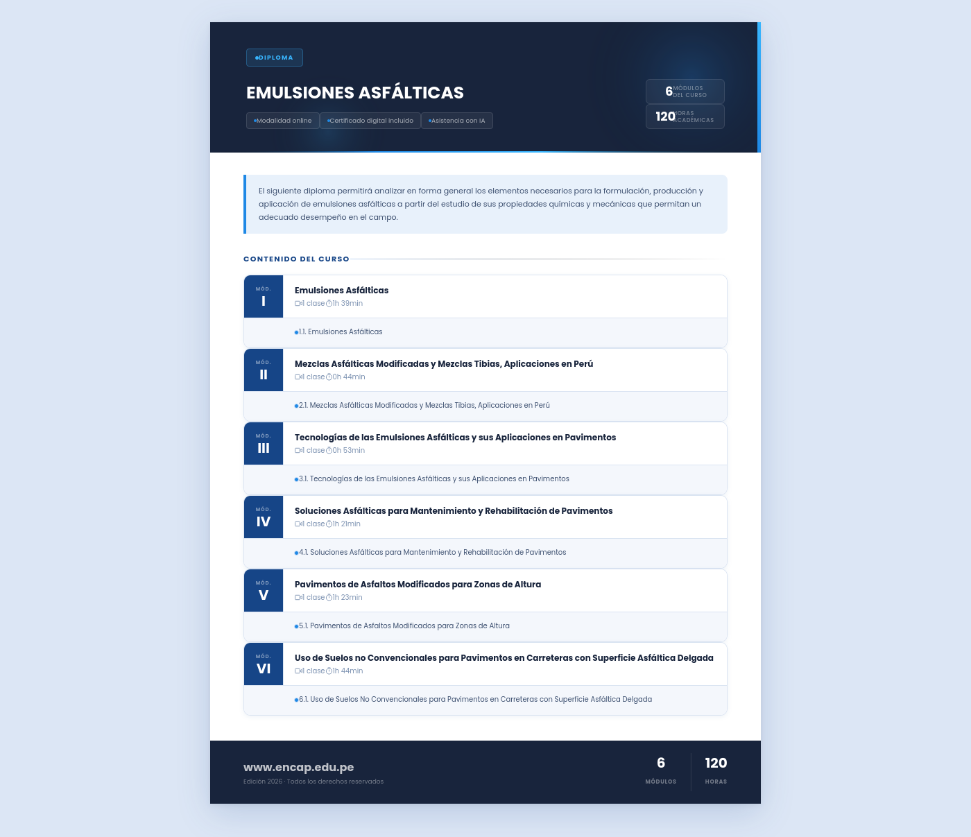 El siguiente diploma permitirá analizar en forma general los elementos necesarios para la formulación, producción y aplicación de emulsiones asfálticas a partir del estudio de sus propiedades químicas y mecánicas que permitan un adecuado desempeño en el campo.