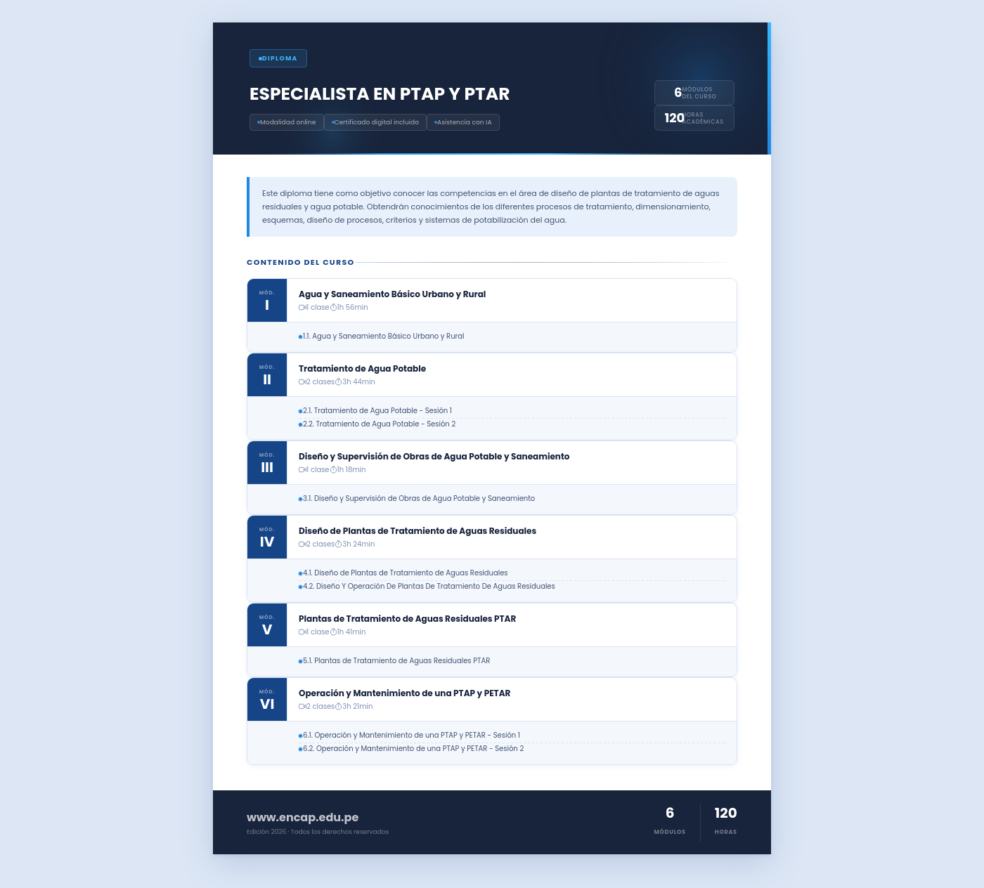 Este diploma tiene como objetivo conocer las competencias en el área de diseño de plantas de tratamiento de aguas residuales y agua potable.