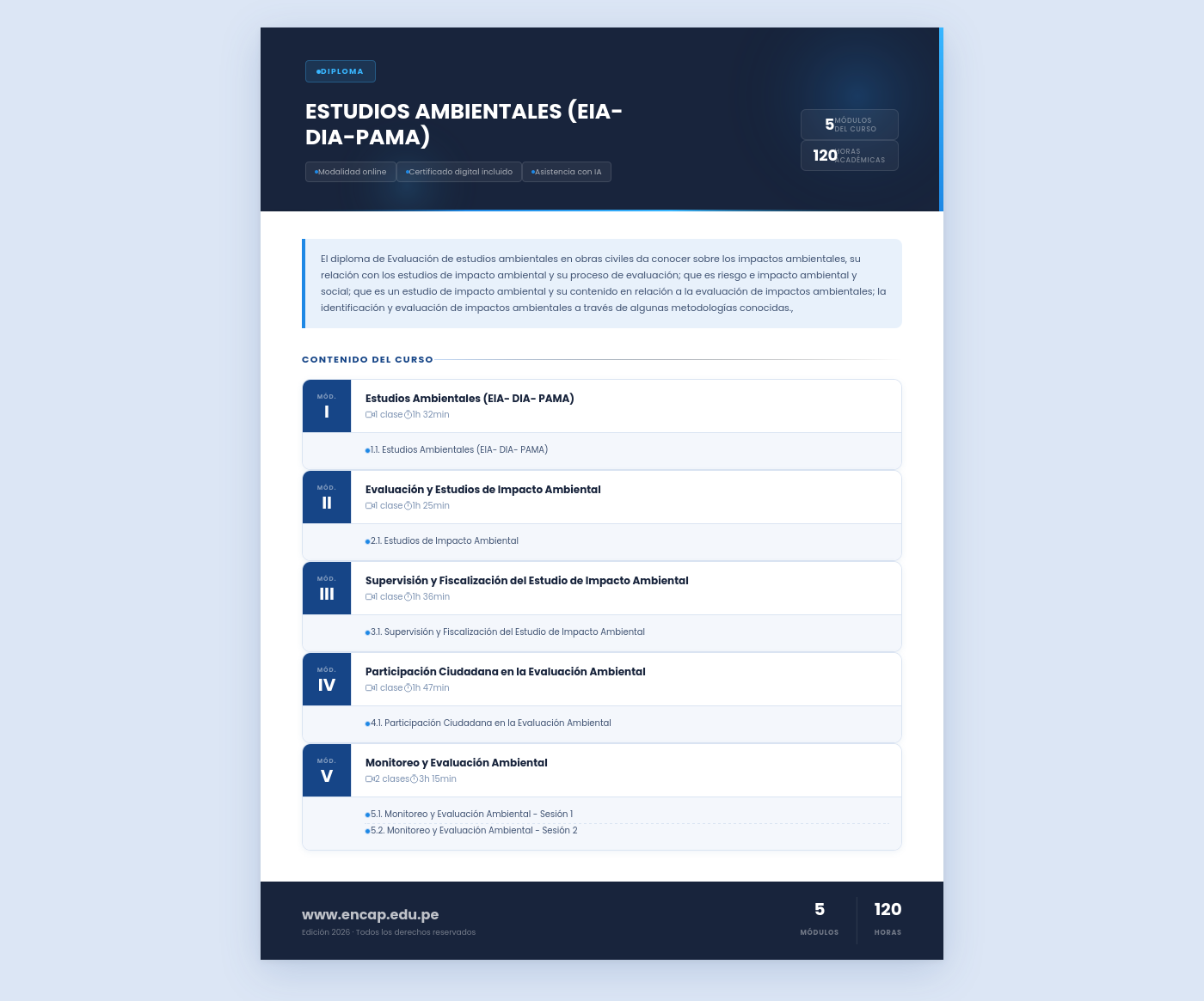 El diploma de Evaluación de estudios ambientales en obras civiles da conocer sobre los impactos ambientales, su relación con los estudios de impacto ambiental y su proceso de evaluación; que es riesgo e impacto ambiental y social; que es un estudio de impacto ambiental y su contenido en relación a la evaluación de impactos ambientales; la identificación y evaluación de impactos ambientales a través de algunas metodologías conocidas.,