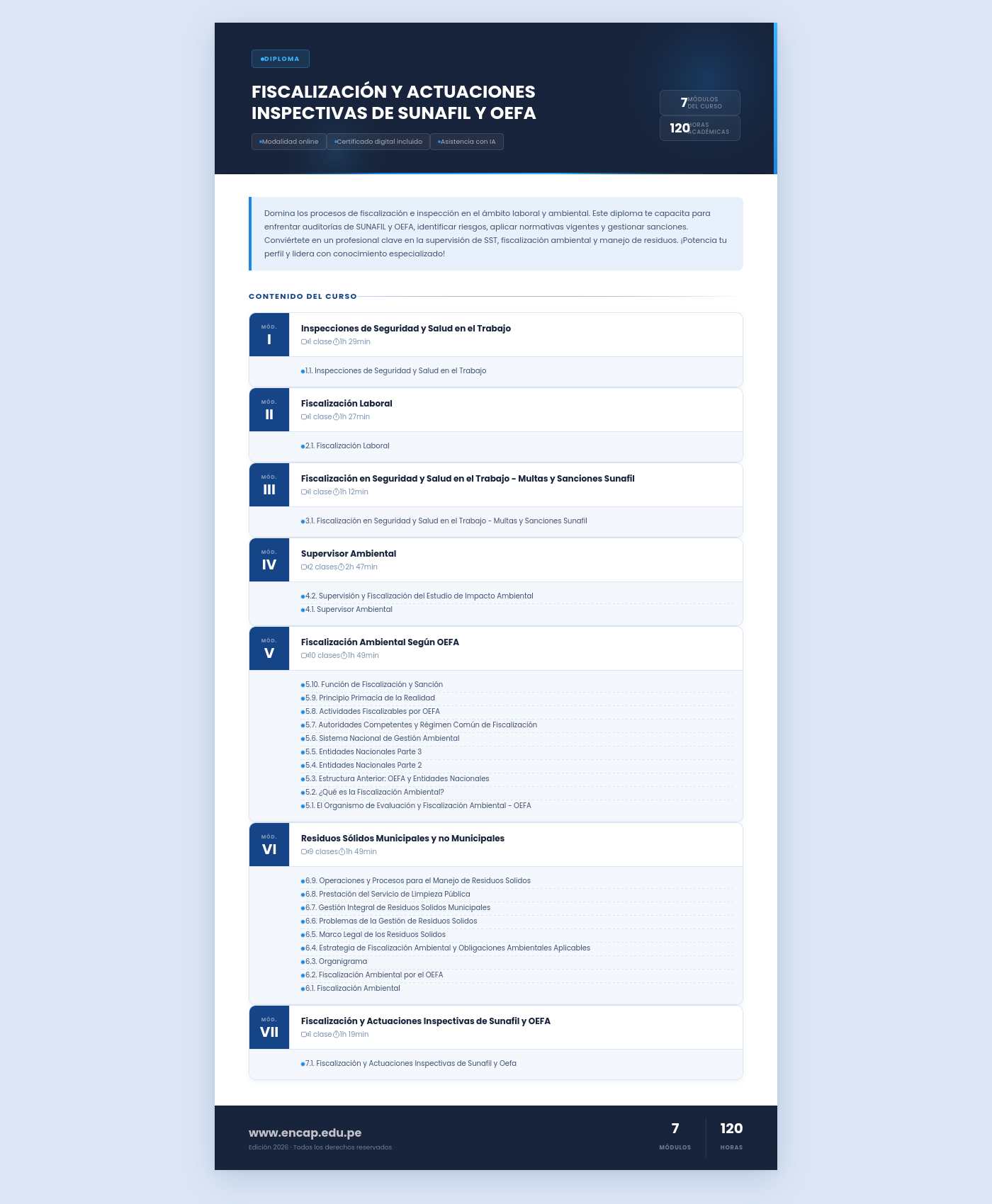 Domina los procesos de fiscalización e inspección en el ámbito laboral y ambiental. Este diploma te capacita para enfrentar auditorías de SUNAFIL y OEFA, identificar riesgos, aplicar normativas vigentes y gestionar sanciones. Conviértete en un profesional clave en la supervisión de SST, fiscalización ambiental y manejo de residuos. ¡Potencia tu perfil y lidera con conocimiento especializado!