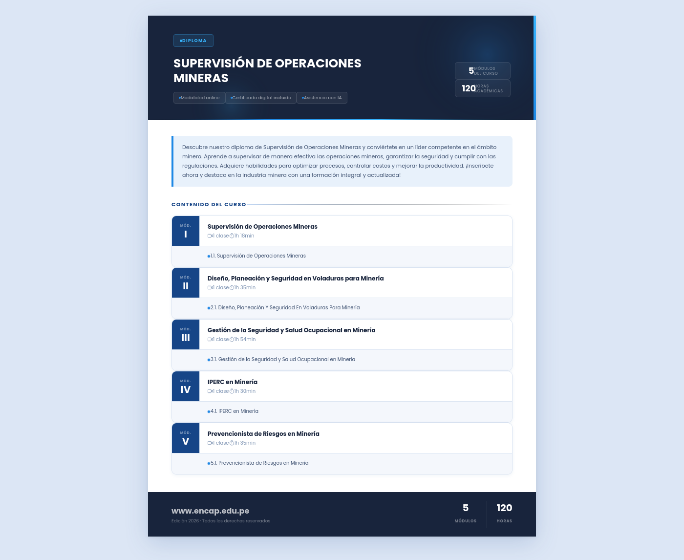 Descubre nuestro diploma de Supervisión de Operaciones Mineras y conviértete en un líder competente en el ámbito minero. Aprende a supervisar de manera efectiva las operaciones mineras, garantizar la seguridad y cumplir con las regulaciones. Adquiere habilidades para optimizar procesos, controlar costos y mejorar la productividad. ¡Inscríbete ahora y destaca en la industria minera con una formación integral y actualizada!