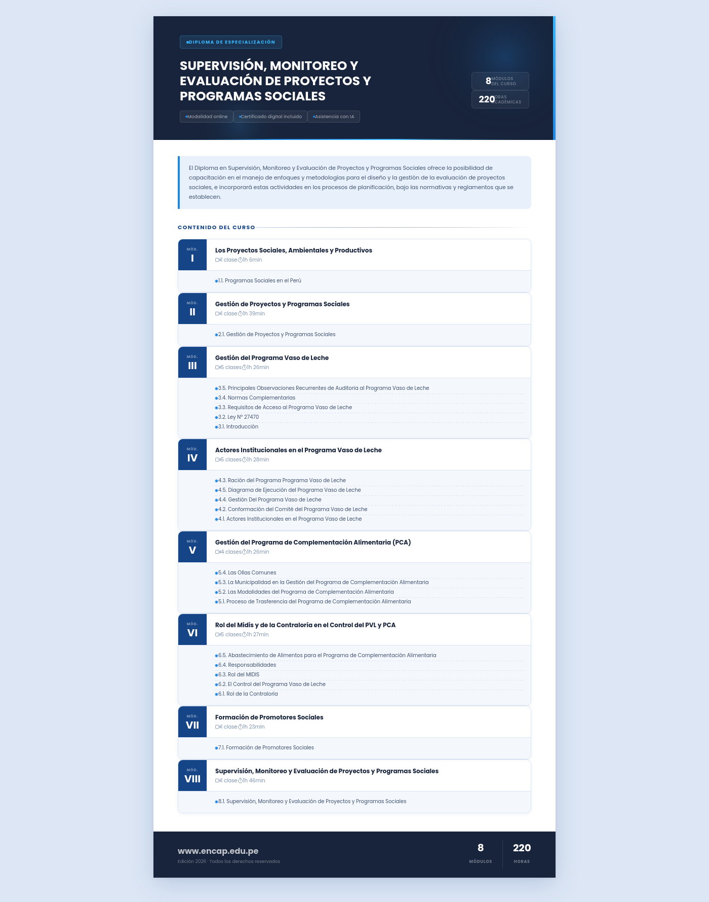 El Diploma en Supervisión, Monitoreo y Evaluación de Proyectos y Programas Sociales ofrece la posibilidad de capacitación en el manejo de enfoques y metodologías para el diseño y la gestión de la evaluación de proyectos sociales, e incorporará estas actividades en los procesos de planificación, bajo las normativas y reglamentos que se establecen.