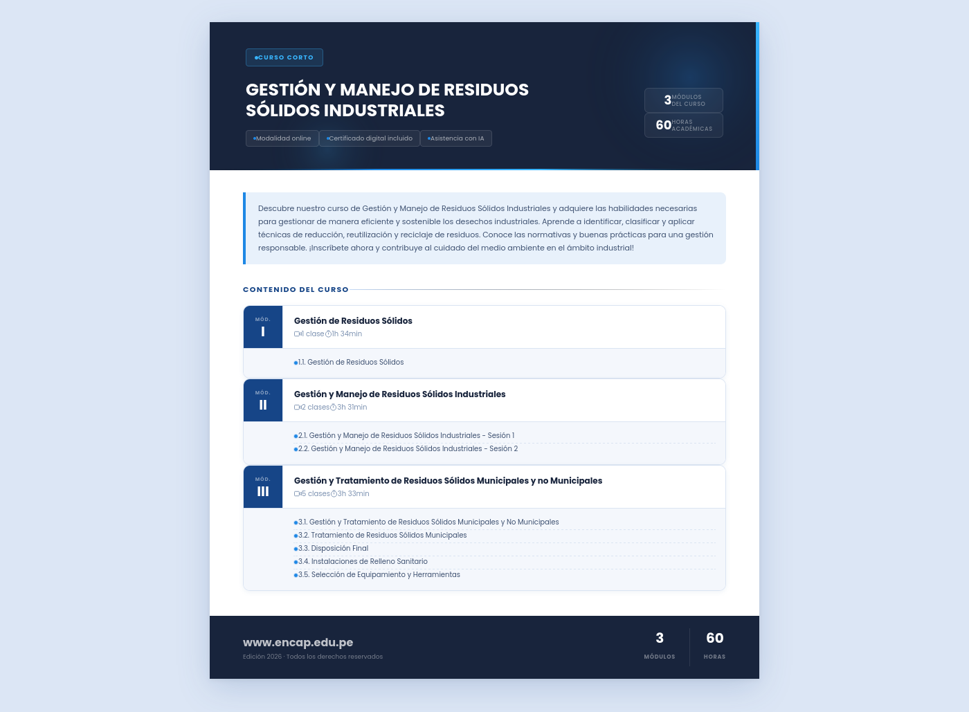 Descubre nuestro curso de Gestión y Manejo de Residuos Sólidos Industriales y adquiere las habilidades necesarias para gestionar de manera eficiente y sostenible los desechos industriales. Aprende a identificar, clasificar y aplicar técnicas de reducción, reutilización y reciclaje de residuos. Conoce las normativas y buenas prácticas para una gestión responsable. ¡Inscríbete ahora y contribuye al cuidado del medio ambiente en el ámbito industrial!
