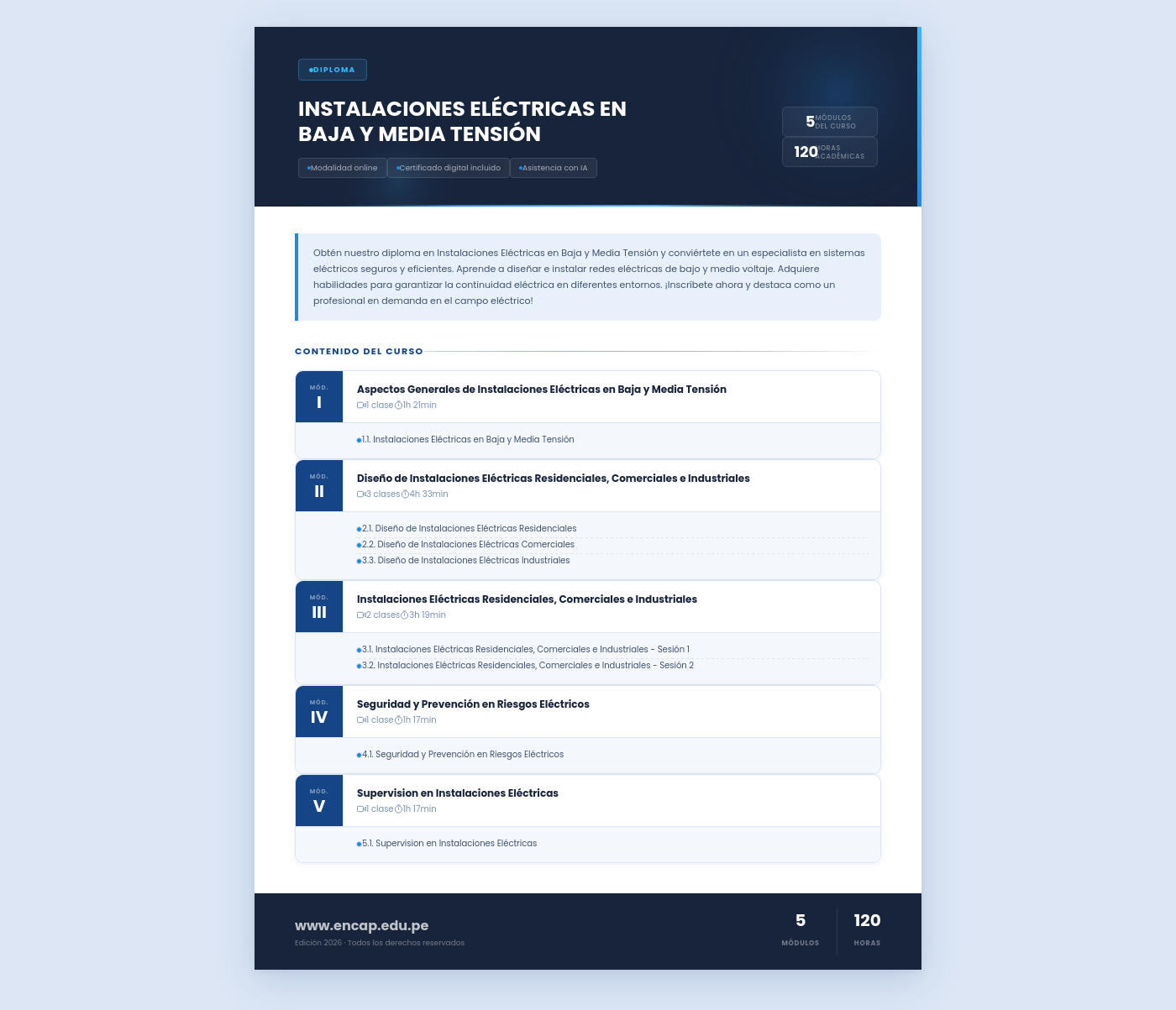 Obtén nuestro diploma en Instalaciones Eléctricas en Baja y Media Tensión y conviértete en un especialista en sistemas eléctricos seguros y eficientes. Aprende a diseñar e instalar redes eléctricas de bajo y medio voltaje. Adquiere habilidades para garantizar la continuidad eléctrica en diferentes entornos. ¡Inscríbete ahora y destaca como un profesional en demanda en el campo eléctrico!