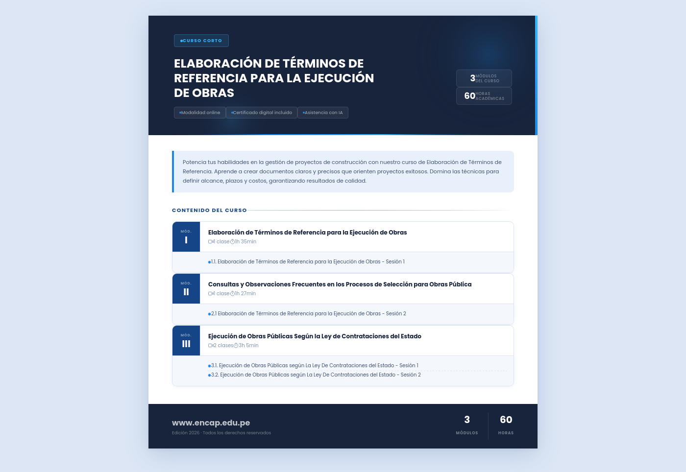 Potencia tus habilidades en la gestión de proyectos de construcción con nuestro curso de Elaboración de Términos de Referencia. Aprende a crear documentos claros y precisos que orienten proyectos exitosos. Domina las técnicas para definir alcance, plazos y costos, garantizando resultados de calidad.
