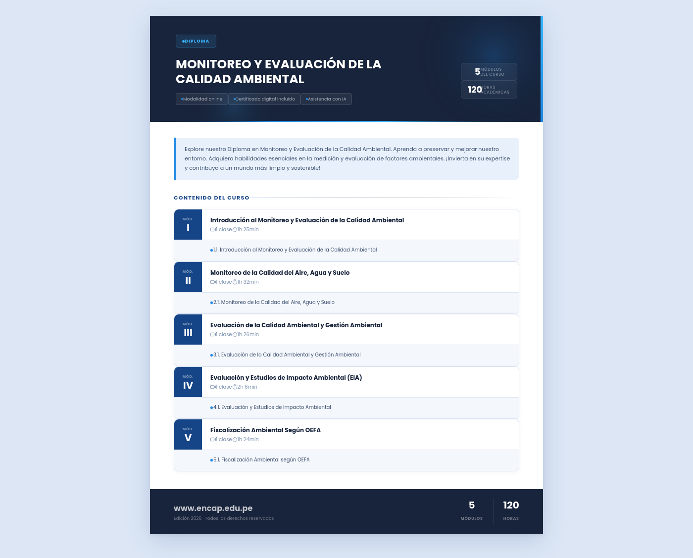 Explore nuestro Diploma en Monitoreo y Evaluación de la Calidad Ambiental. Aprenda a preservar y mejorar nuestro entorno. Adquiera habilidades esenciales en la medición y evaluación de factores ambientales. ¡Invierta en su expertise y contribuya a un mundo más limpio y sostenible!