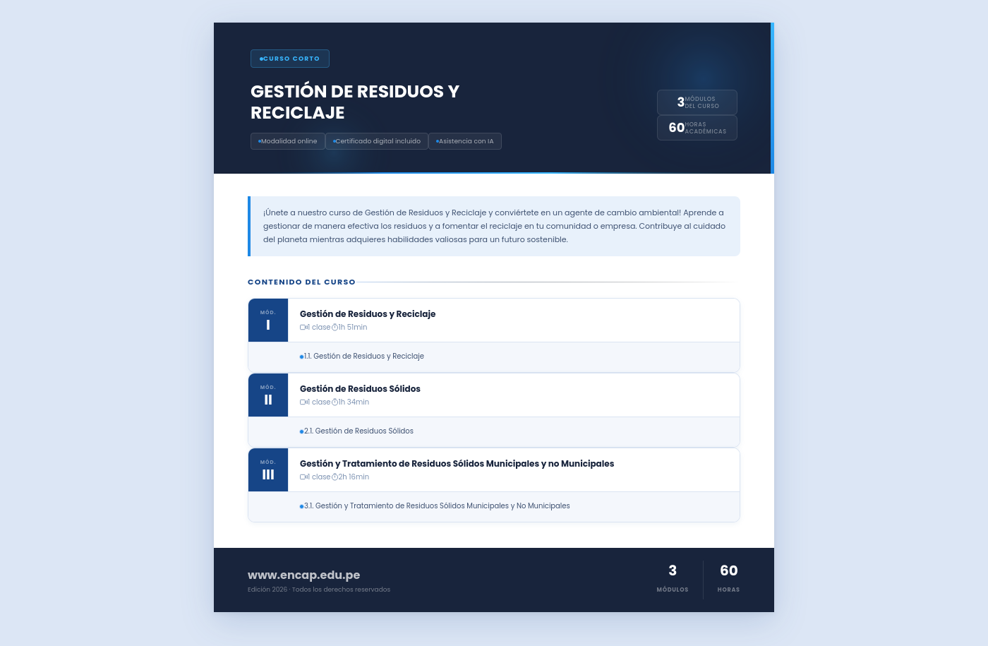 ¡Únete a nuestro curso de Gestión de Residuos y Reciclaje y conviértete en un agente de cambio ambiental! Aprende a gestionar de manera efectiva los residuos y a fomentar el reciclaje en tu comunidad o empresa. Contribuye al cuidado del planeta mientras adquieres habilidades valiosas para un futuro sostenible.