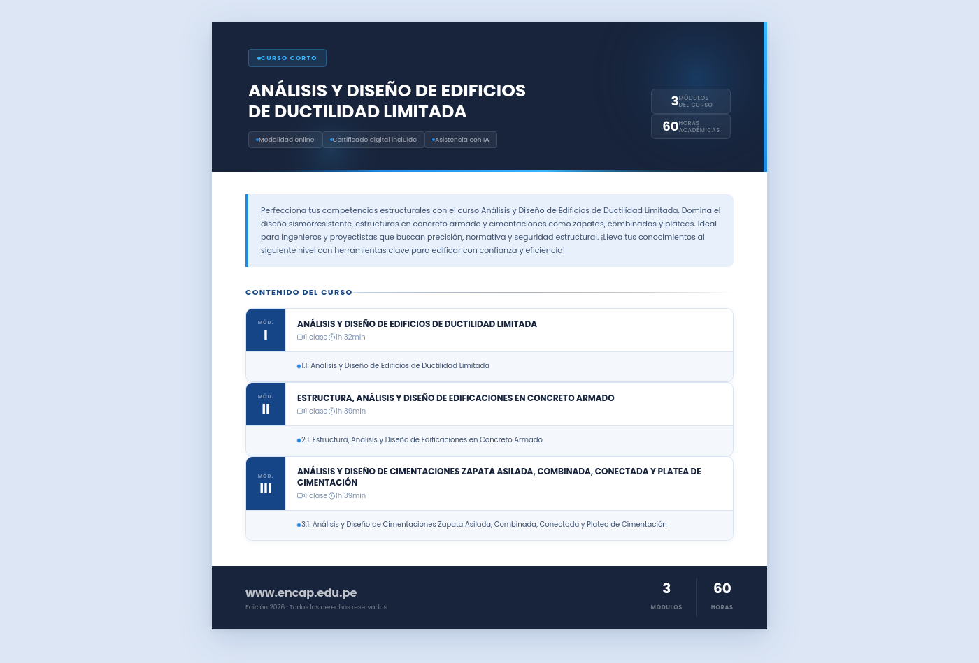 Perfecciona tus competencias estructurales con el curso Análisis y Diseño de Edificios de Ductilidad Limitada. Domina el diseño sismorresistente, estructuras en concreto armado y cimentaciones como zapatas, combinadas y plateas. Ideal para ingenieros y proyectistas que buscan precisión, normativa y seguridad estructural. ¡Lleva tus conocimientos al siguiente nivel con herramientas clave para edificar con confianza y eficiencia!