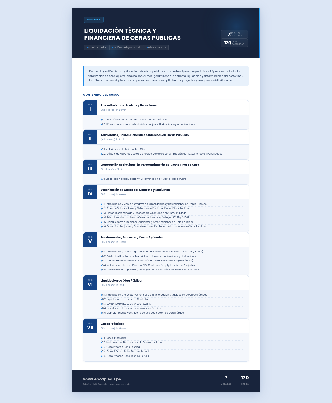 ¡Domina la gestión técnica y financiera de obras públicas con nuestro diploma especializado! Aprende a calcular la valorización de obra, ajustes, deducciones y más, garantizando la correcta liquidación y determinación del costo final. ¡Inscríbete ahora y adquiere las competencias clave para optimizar tus proyectos y asegurar su éxito financiero!