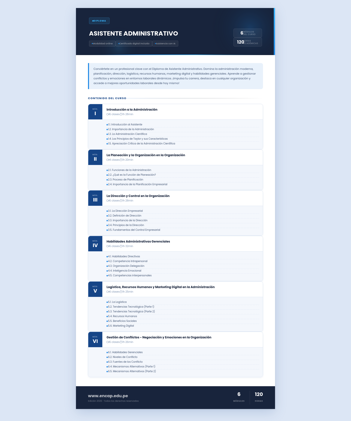 Conviértete en un profesional clave con el Diploma de Asistente Administrativo. Domina la administración moderna, planificación, dirección, logística, recursos humanos, marketing digital y habilidades gerenciales. Aprende a gestionar conflictos y emociones en entornos laborales dinámicos. ¡Impulsa tu carrera, destaca en cualquier organización y accede a mejores oportunidades laborales desde hoy mismo!