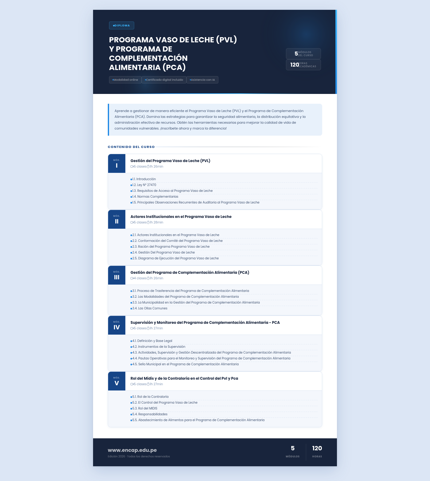 Aprende a gestionar de manera eficiente el Programa Vaso de Leche (PVL) y el Programa de Complementación Alimentaria (PCA). Domina las estrategias para garantizar la seguridad alimentaria, la distribución equitativa y la administración efectiva de recursos. Obtén las herramientas necesarias para mejorar la calidad de vida de comunidades vulnerables. ¡Inscríbete ahora y marca la diferencia!