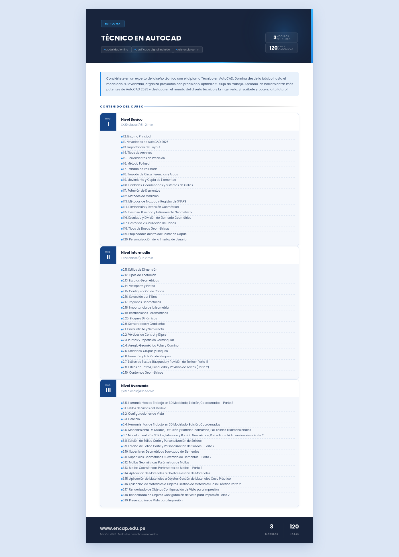 Conviértete en un experto del diseño técnico con el diploma Técnico en AutoCAD. Domina desde lo básico hasta el modelado 3D avanzado, organiza proyectos con precisión y optimiza tu flujo de trabajo. Aprende las herramientas más potentes de AutoCAD 2023 y destaca en el mundo del diseño técnico y la ingeniería. ¡Inscríbete y potencia tu futuro!