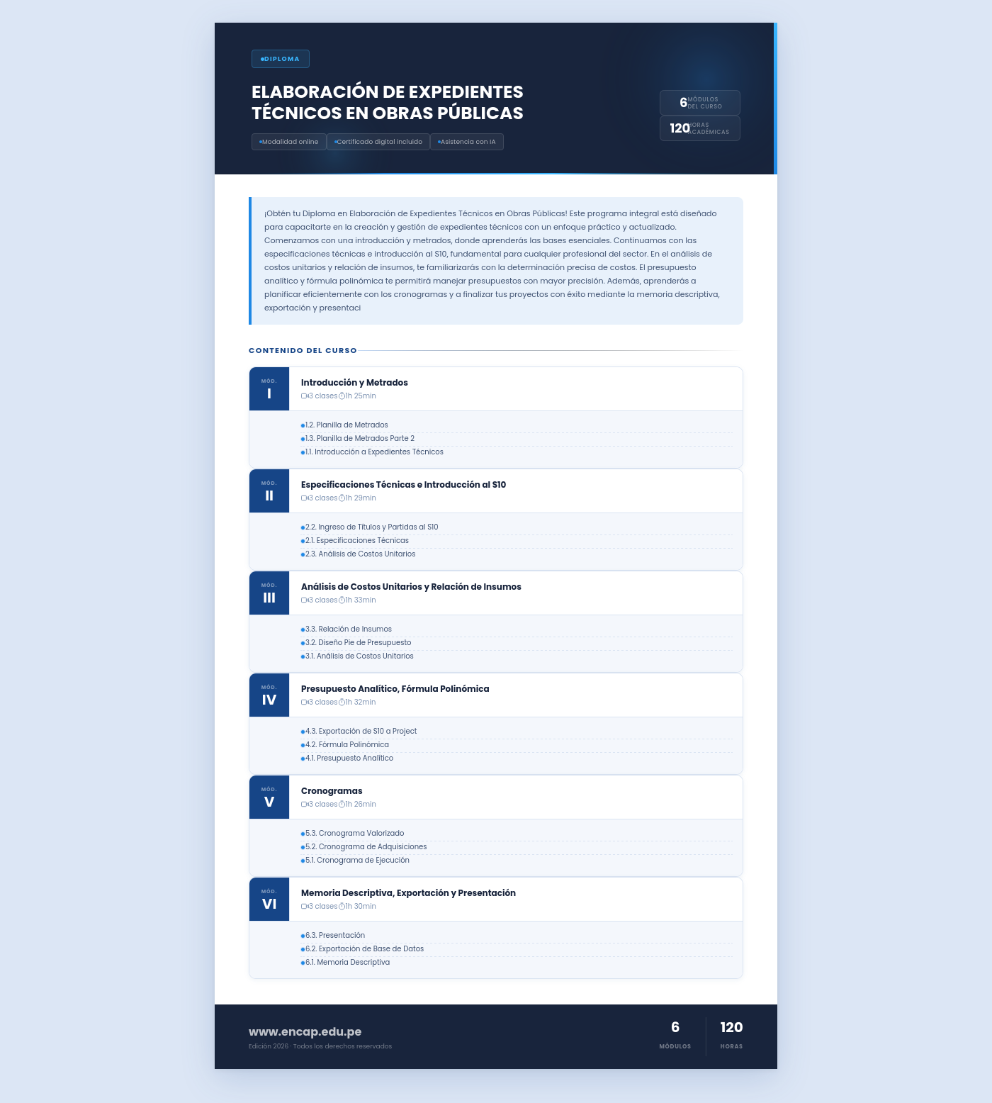 ¡Obtén tu Diploma en Elaboración de Expedientes Técnicos en Obras Públicas! Este programa integral está diseñado para capacitarte en la creación y gestión de expedientes técnicos con un enfoque práctico y actualizado. Comenzamos con una introducción y metrados, donde aprenderás las bases esenciales. Continuamos con las especificaciones técnicas e introducción al S10, fundamental para cualquier profesional del sector. En el análisis de costos unitarios y relación de insumos, te familiarizarás con la determinación precisa de costos. El presupuesto analítico y fórmula polinómica te permitirá manejar presupuestos con mayor precisión. Además, aprenderás a planificar eficientemente con los cronogramas y a finalizar tus proyectos con éxito mediante la memoria descriptiva, exportación y presentaci