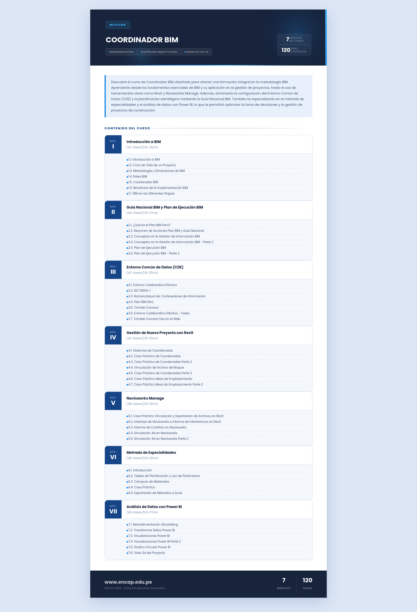Descubre el curso de Coordinador BIM, diseñado para ofrecer una formación integral en la metodología BIM. Aprenderás desde los fundamentos esenciales de BIM y su aplicación en la gestión de proyectos, hasta el uso de herramientas clave como Revit y Navisworks Manage. Además, dominarás la configuración del Entorno Común de Datos (CDE) y la planificación estratégica mediante la Guía Nacional BIM. También te especializarás en el metrado de especialidades y el análisis de datos con Power BI, lo que te permitirá optimizar la toma de decisiones y la gestión de proyectos de construcción.