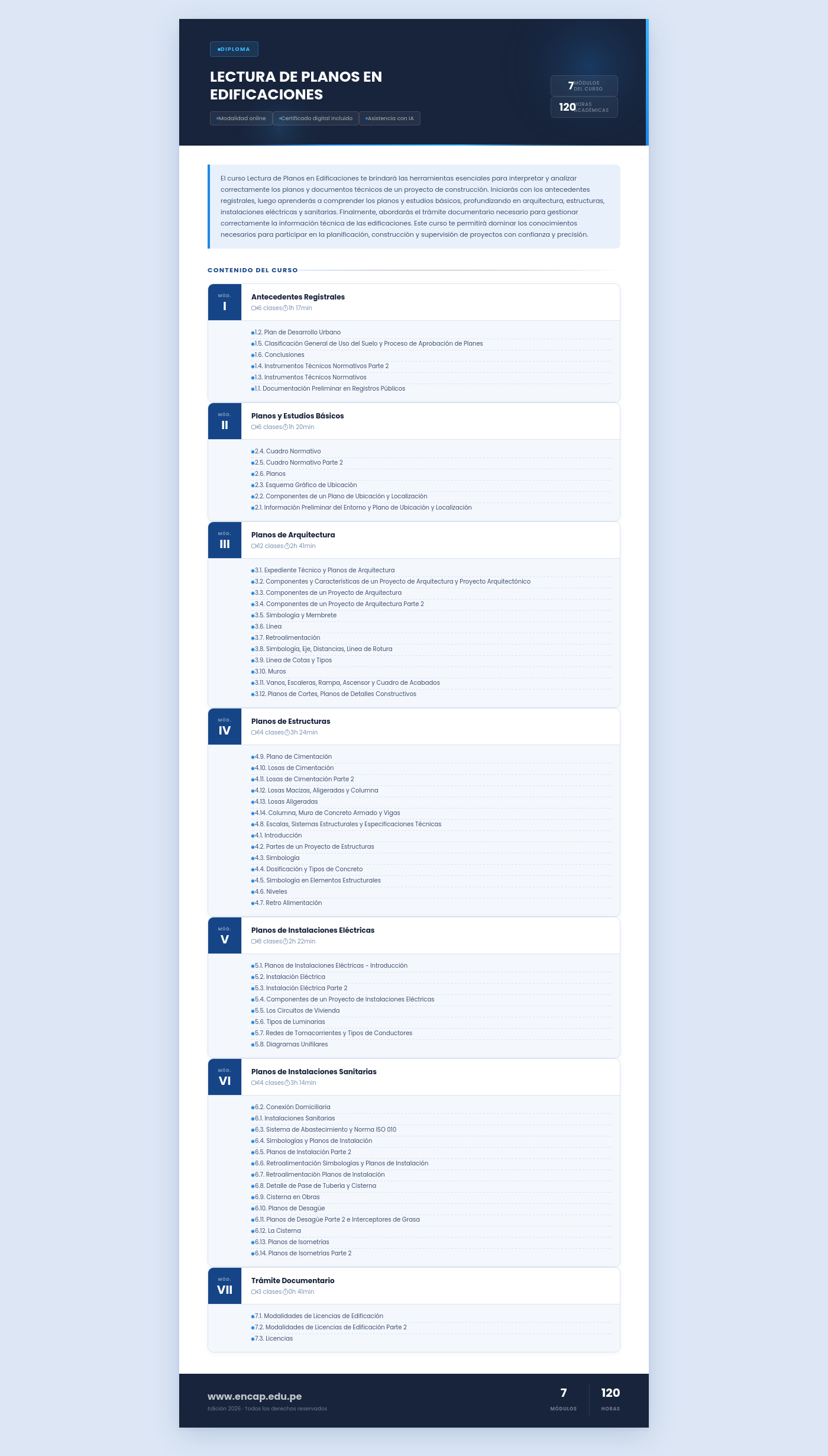 El curso Lectura de Planos en Edificaciones te brindará las herramientas esenciales para interpretar y analizar correctamente los planos y documentos técnicos de un proyecto de construcción. Iniciarás con los antecedentes registrales, luego aprenderás a comprender los planos y estudios básicos, profundizando en arquitectura, estructuras, instalaciones eléctricas y sanitarias. Finalmente, abordarás el trámite documentario necesario para gestionar correctamente la información técnica de las edificaciones. Este curso te permitirá dominar los conocimientos necesarios para participar en la planificación, construcción y supervisión de proyectos con confianza y precisión.
