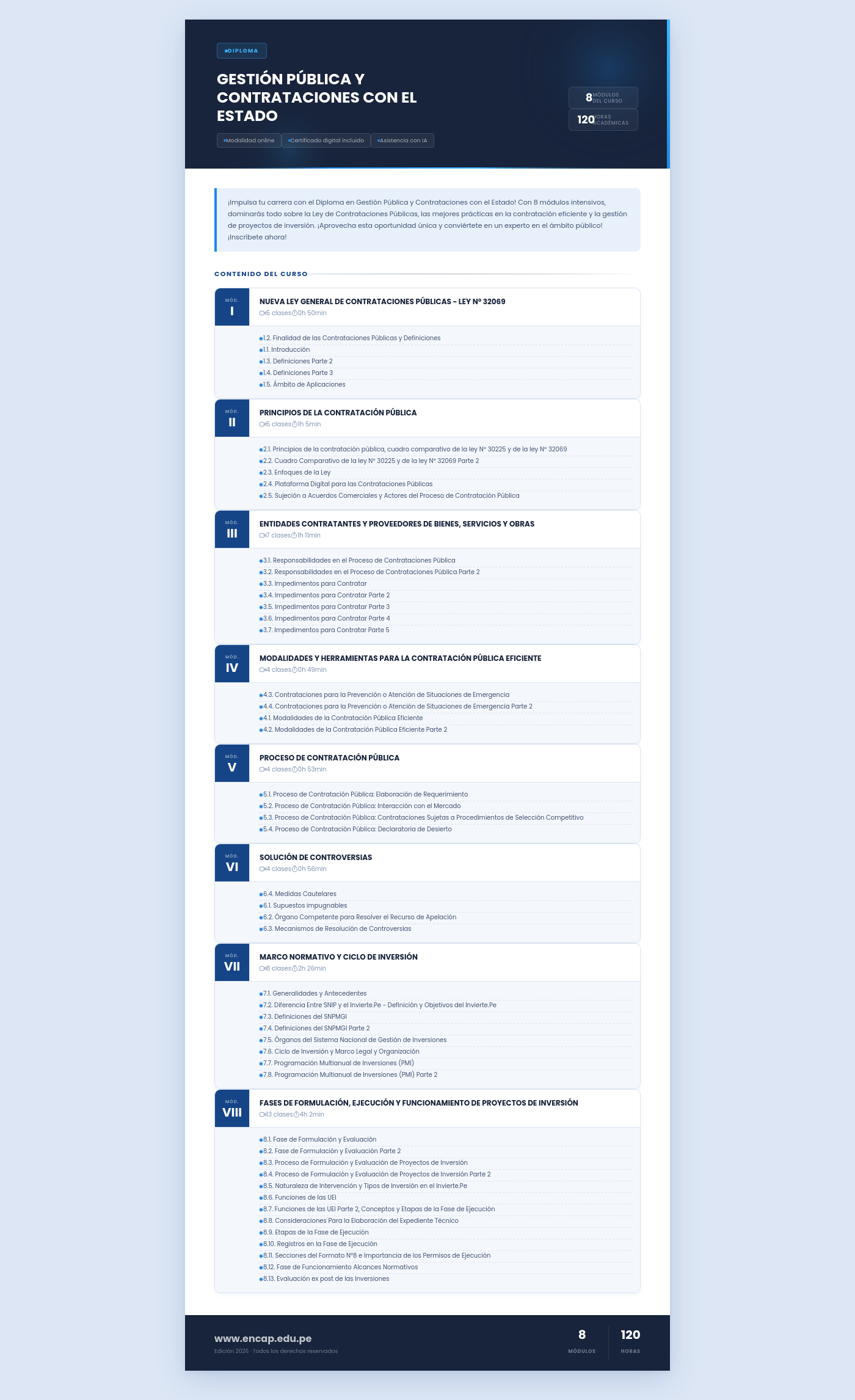 ¡Impulsa tu carrera con el Diploma en Gestión Pública y Contrataciones con el Estado! Con 8 módulos intensivos, dominarás todo sobre la Ley de Contrataciones Públicas, las mejores prácticas en la contratación eficiente y la gestión de proyectos de inversión. ¡Aprovecha esta oportunidad única y conviértete en un experto en el ámbito público! ¡Inscríbete ahora!