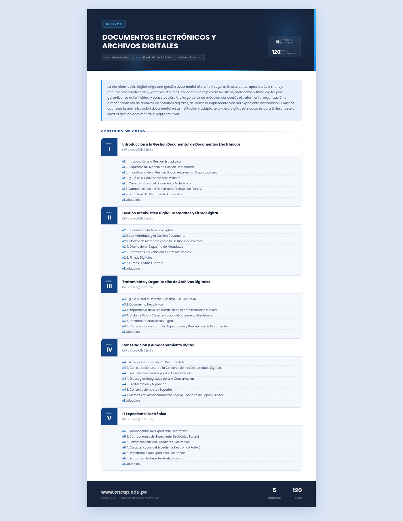 La transformación digital exige una gestión documental eficiente y segura. En este curso, aprenderás a manejar documentos electrónicos y archivos digitales, aplicando principios archivísticos, metadatos y firma digital para garantizar su autenticidad y conservación. A lo largo de cinco módulos, conocerás el tratamiento, organización y almacenamiento de archivos en entornos digitales, así como la implementación del expediente electrónico. Si buscas optimizar la administración documental en tu institución y adaptarte a la era digital, este curso es para ti. ¡Inscríbete y lleva tu gestión documental al siguiente nivel!