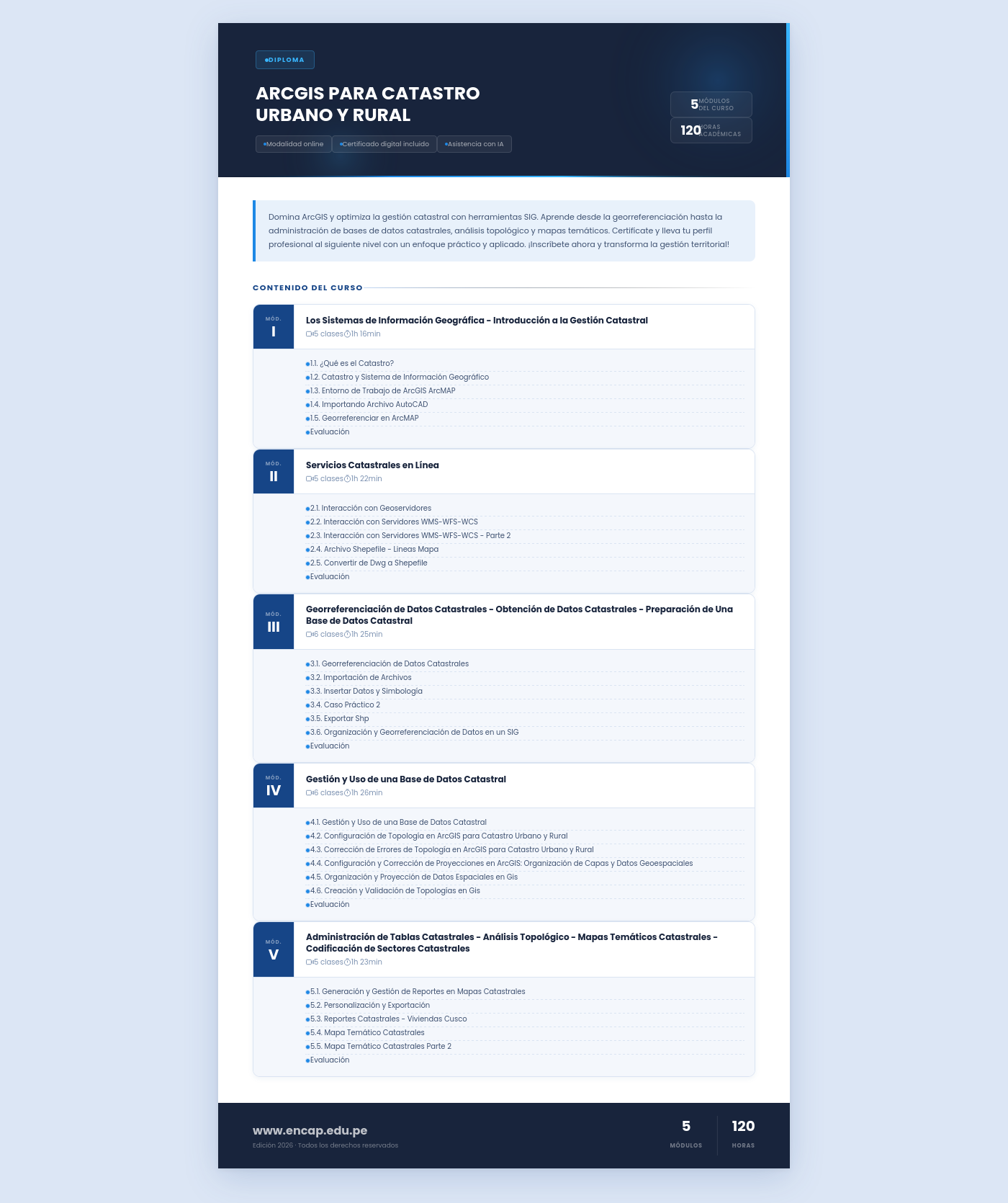 Domina ArcGIS y optimiza la gestión catastral con herramientas SIG. Aprende desde la georreferenciación hasta la administración de bases de datos catastrales, análisis topológico y mapas temáticos. Certifícate y lleva tu perfil profesional al siguiente nivel con un enfoque práctico y aplicado. ¡Inscríbete ahora y transforma la gestión territorial!