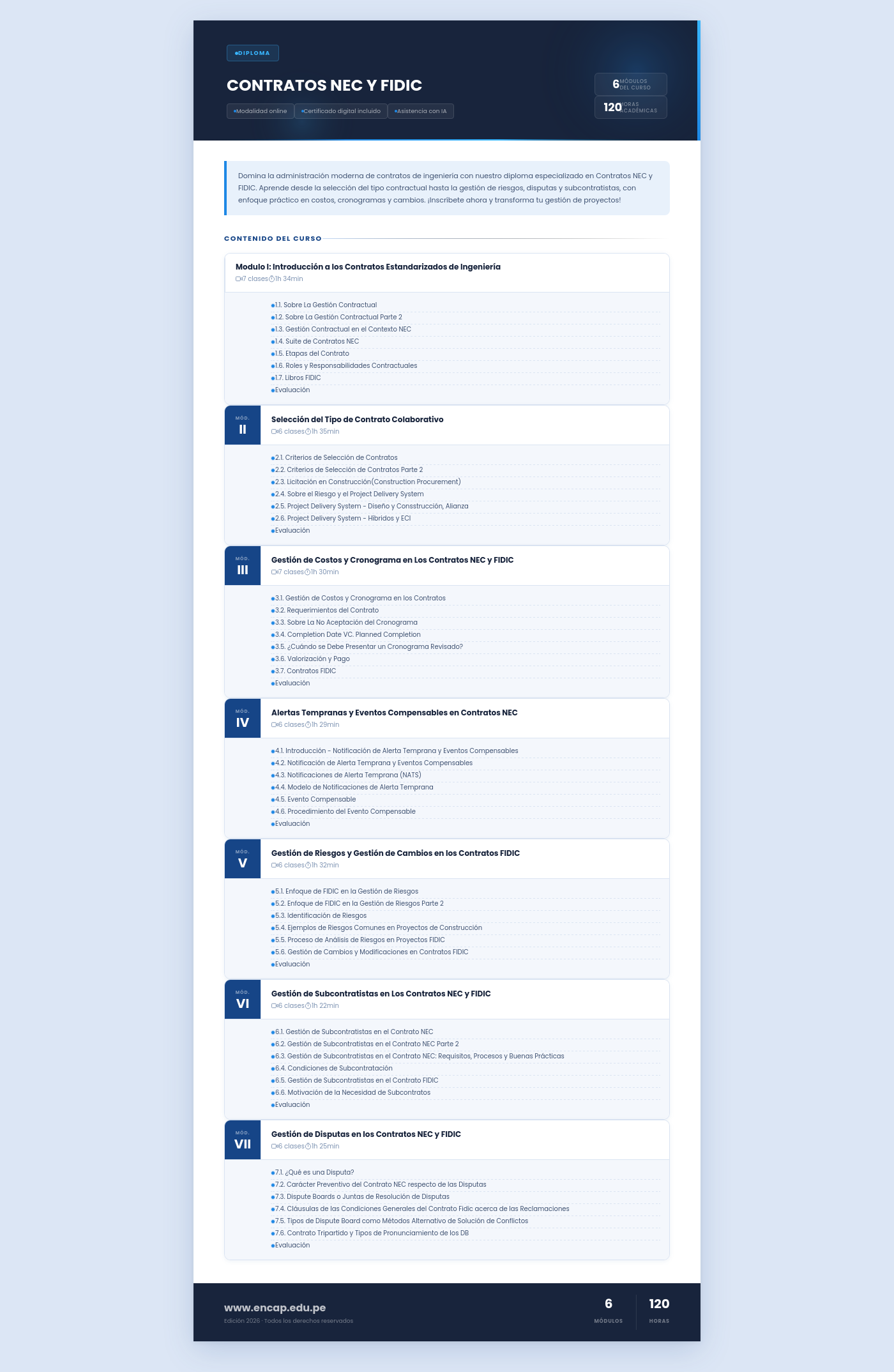 Domina la administración moderna de contratos de ingeniería con nuestro diploma especializado en Contratos NEC y FIDIC. Aprende desde la selección del tipo contractual hasta la gestión de riesgos, disputas y subcontratistas, con enfoque práctico en costos, cronogramas y cambios. ¡Inscríbete ahora y transforma tu gestión de proyectos!
