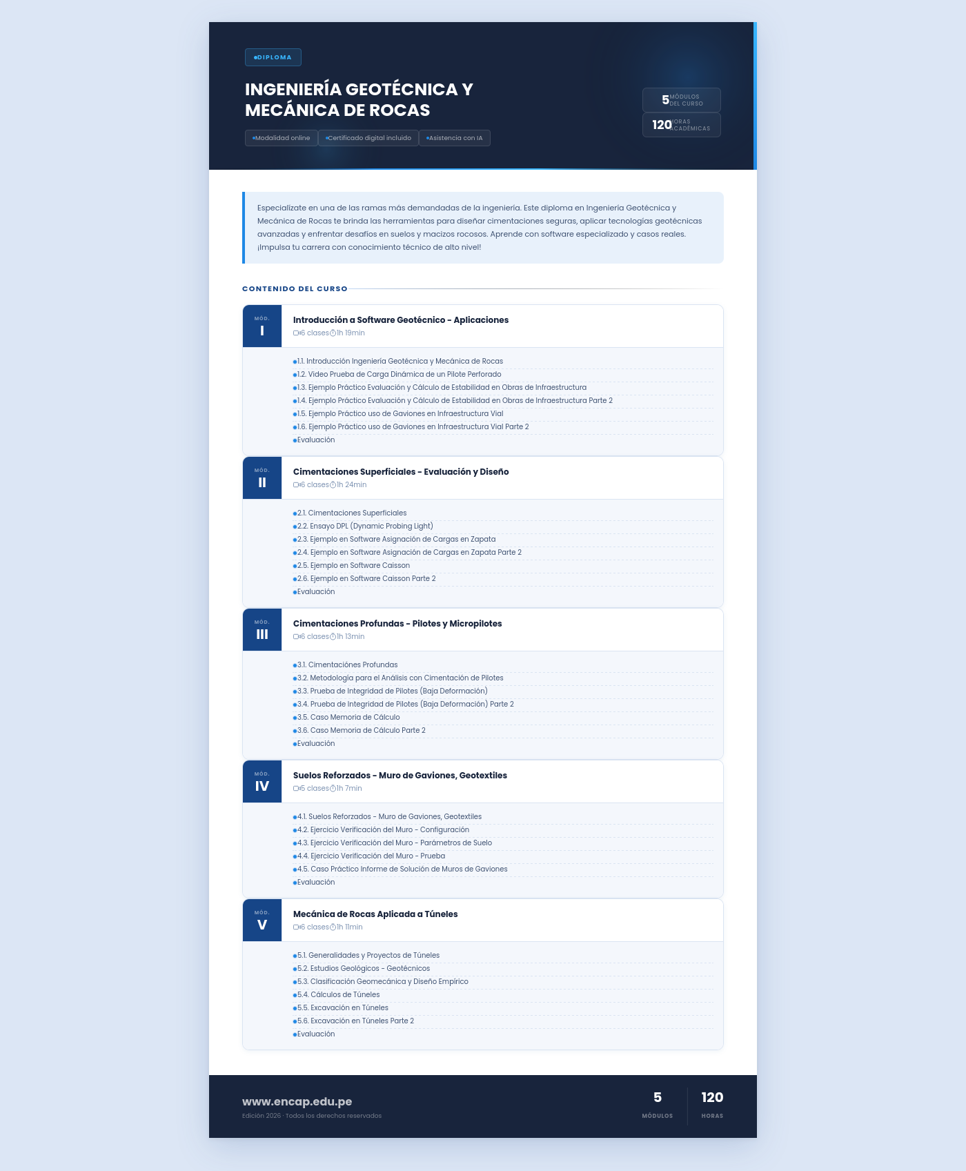 Especialízate en una de las ramas más demandadas de la ingeniería. Este diploma en Ingeniería Geotécnica y Mecánica de Rocas te brinda las herramientas para diseñar cimentaciones seguras, aplicar tecnologías geotécnicas avanzadas y enfrentar desafíos en suelos y macizos rocosos. Aprende con software especializado y casos reales. ¡Impulsa tu carrera con conocimiento técnico de alto nivel!