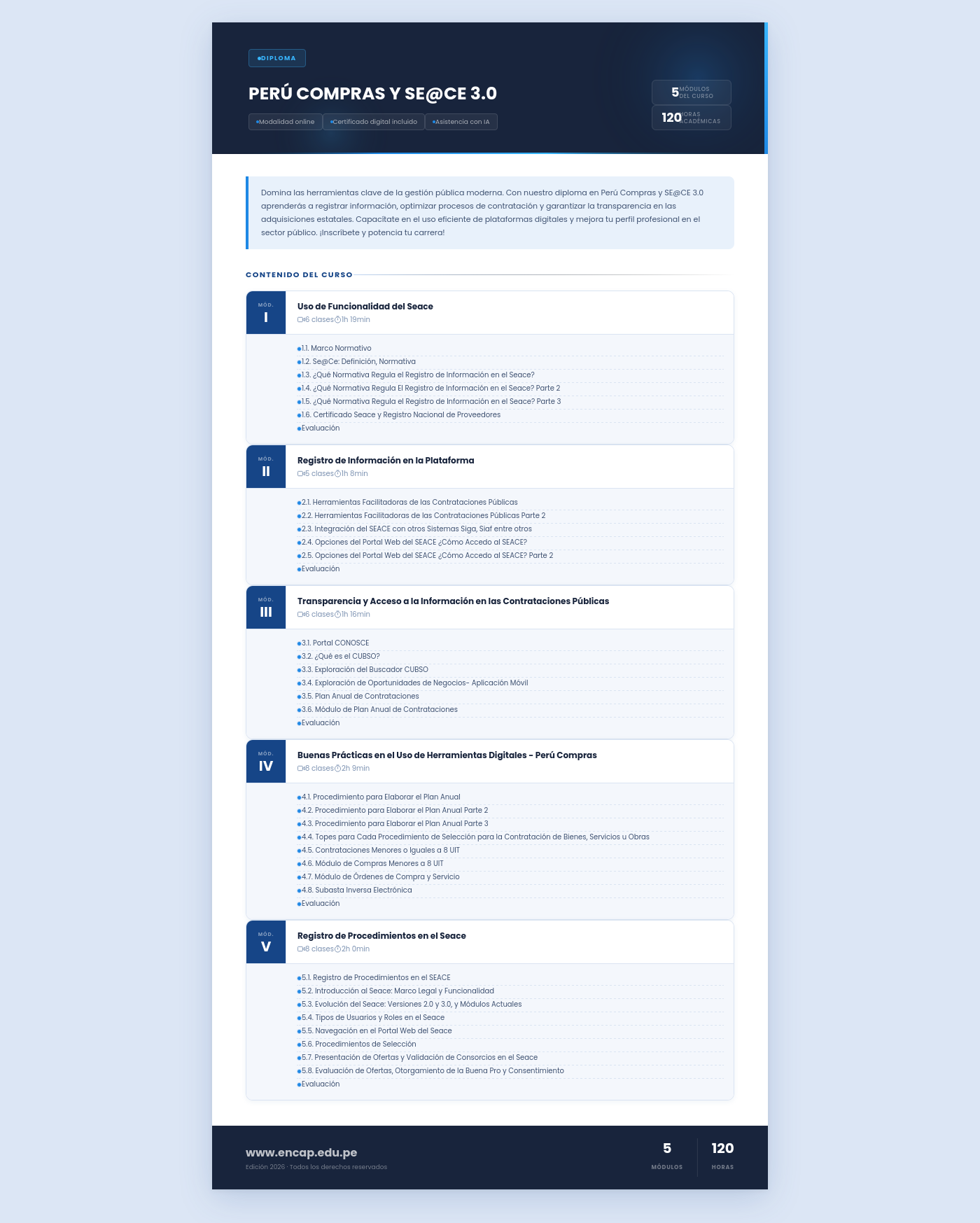 Domina las herramientas clave de la gestión pública moderna. Con nuestro diploma en Perú Compras y SE@CE 3.0 aprenderás a registrar información, optimizar procesos de contratación y garantizar la transparencia en las adquisiciones estatales. Capacítate en el uso eficiente de plataformas digitales y mejora tu perfil profesional en el sector público. ¡Inscríbete y potencia tu carrera!