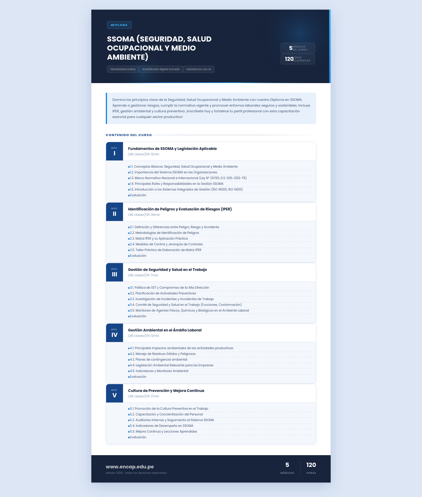 Domina los principios clave de la Seguridad, Salud Ocupacional y Medio Ambiente con nuestro Diploma en SSOMA. Aprende a gestionar riesgos, cumplir la normativa vigente y promover entornos laborales seguros y sostenibles. Incluye IPER, gestión ambiental y cultura preventiva. ¡Inscríbete hoy y fortalece tu perfil profesional con esta capacitación esencial para cualquier sector productivo!